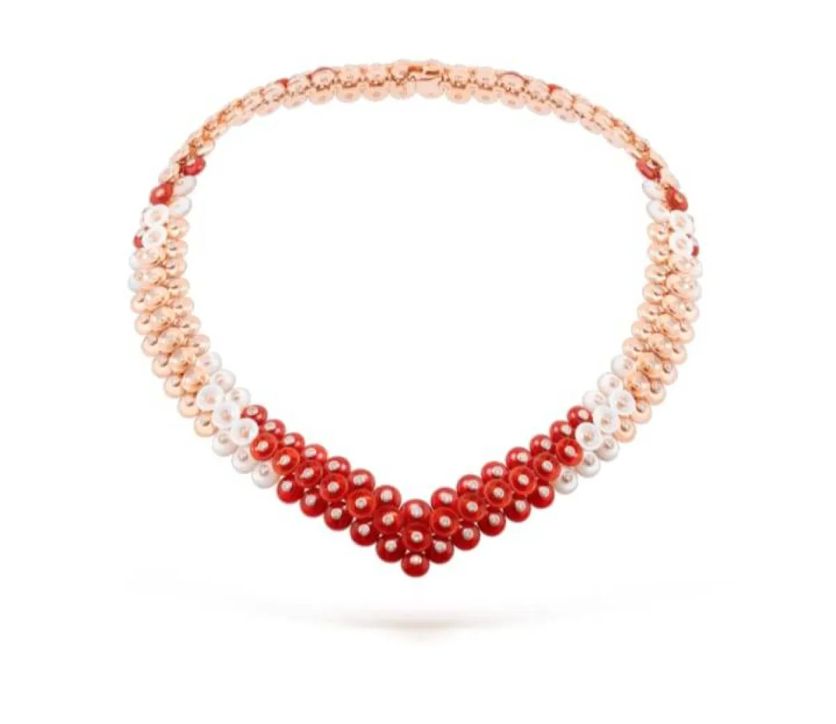 ننصحكِ بإختيار هذا التصميم من دار فان كليف أند آربلز Van cleef &Arpels لعقد مصنوع من الذهب الوردي عيار 18 قيراطاً ومرصع بعرق اللؤلؤ الأبيض والعقيق الأبيض والماسات المستديرة اللامعة وحجر العقيق الأحمر وجاء إبزيم العقد للرافعة من الذهب الوردي وشفرة من الذهب الأبيض وحجر الكارنيليان الأحمر .