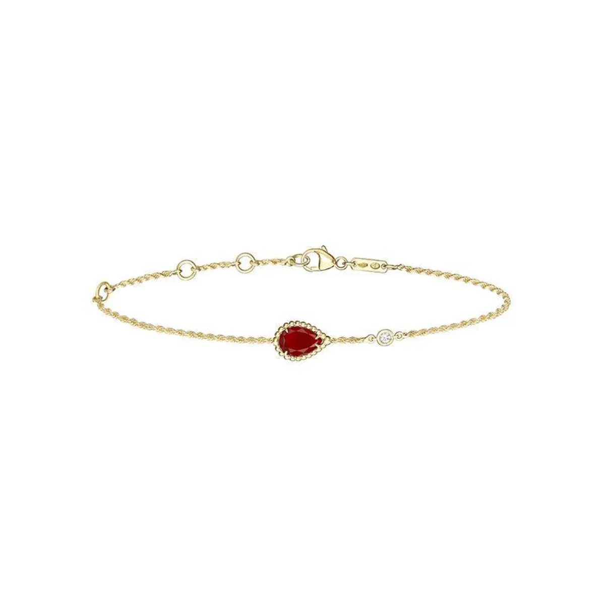 اعتمدي هذا التصميم من علامة بوشرون Boucheron لسوار مصمم من الذهب الأصفر عيار 18 قيراطاً ومرصعة بحجر العقيق على شكل كمثري مع الماسات المستديرة اللامعة، وجاءت السلسلة ملتوية من الذهب الأصفر وماسة مستديرة وزخرفة قطرة من العقيق تكمل بعضها البعض في هذا الإبداع الذي يجمع بين براعة الذهب المنحوت وقوة التباين .