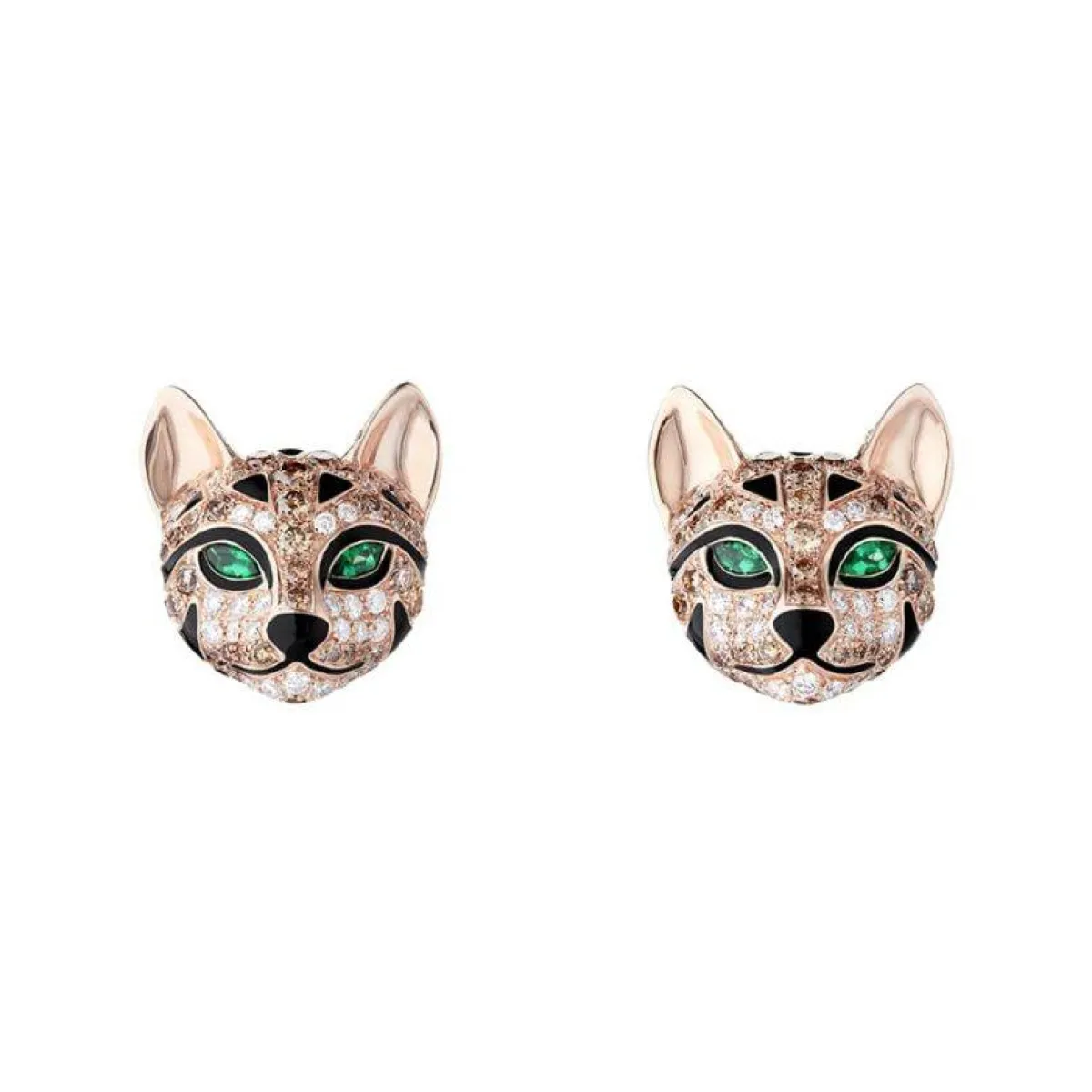 جاءت الأقراط مُرصوفة بـ 170 ماسة مستديرة 1.73 قيراط، و62 ماسة مستديرة 0.31 قيراط، إضافة إلى عيون مُرصعة بـ4 زمردات 0.14 قيراط، وأنف مرقطة بالورنيش الأسود.
