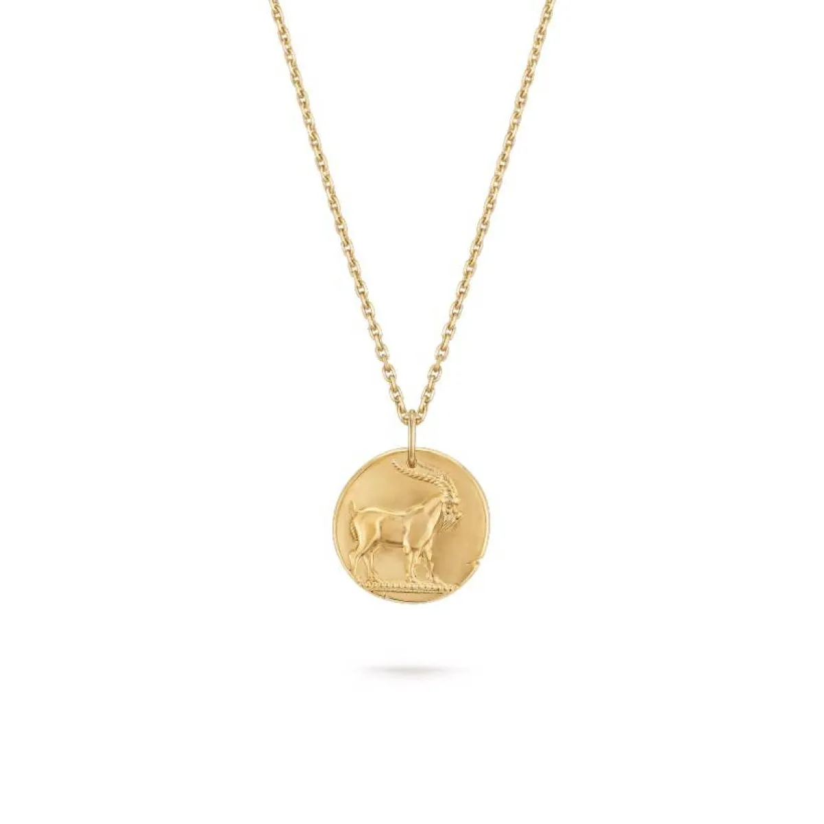 صُممت السلسلة من الذهب الأصفر على شكل قلادة دائرية متوسطة الحجم منحوتة بجدي، بتصميم جذاب يخطف الأنظار.