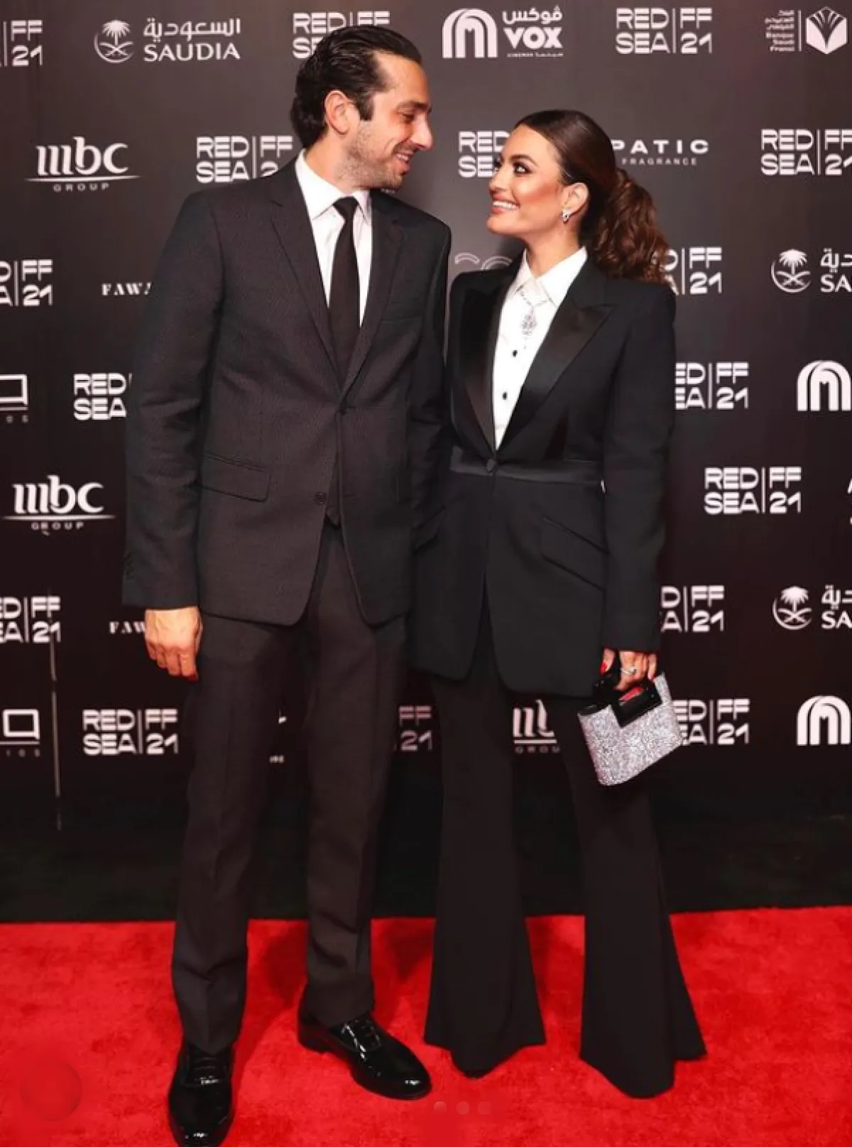 تألقت بفستان ملكي أحمر يترافق معه كاب يعقد عند الأكتاف فبدت كأميرة بفستانها الراقي الذي حمل توقيع المصمم اللبناني العالمي جورج حبيقة. ورافقها زوجها الإعلامي وسام بريدي الذي تألق في بذلة من تصميم توم فورد Tom Ford.