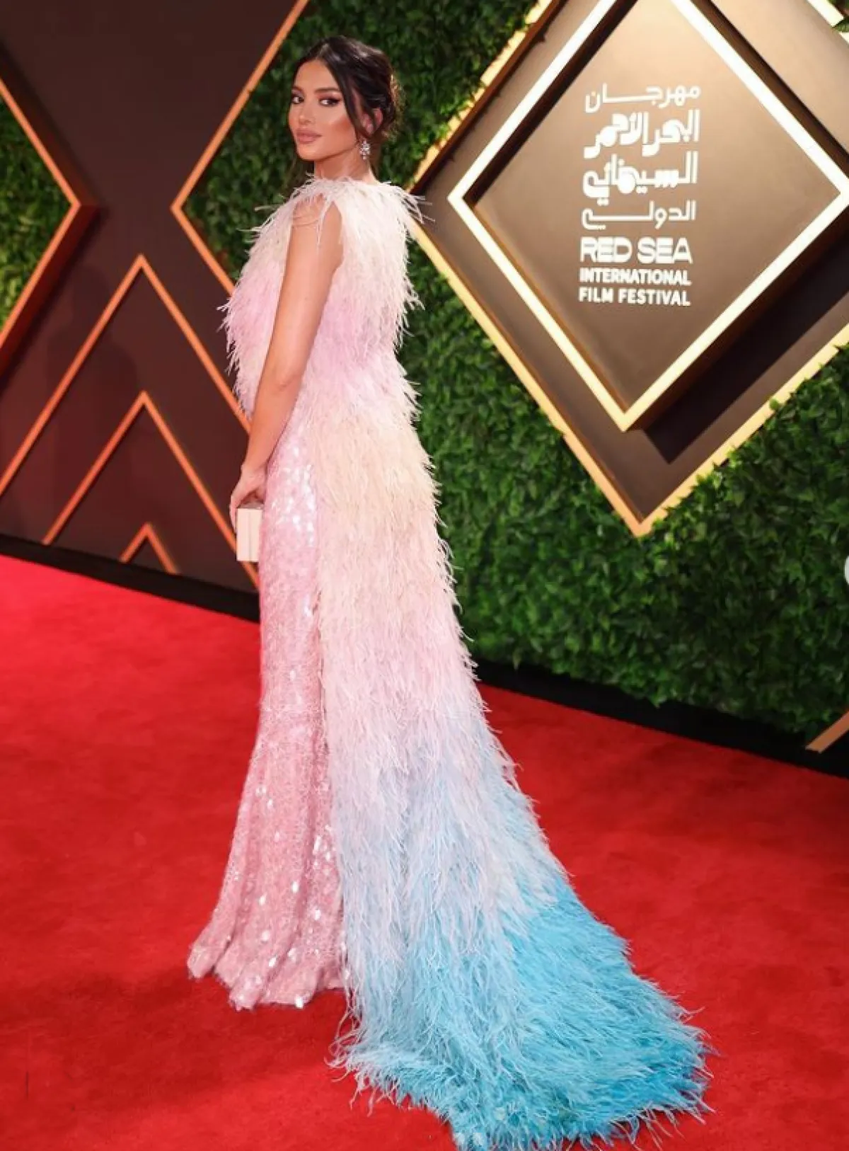 تألقت بفستان من الريش المتموج بألوان الأبيض والزهري والأزرق بكافة تدريجاتهما، ورفعت شعرها على شكل شينيون كلاسيكي عصري طبيعي تنسدل منه خصلات تحيط بوجهها. وحملت كلاتش زهري. الفستان من تصميم رامي قاضي.