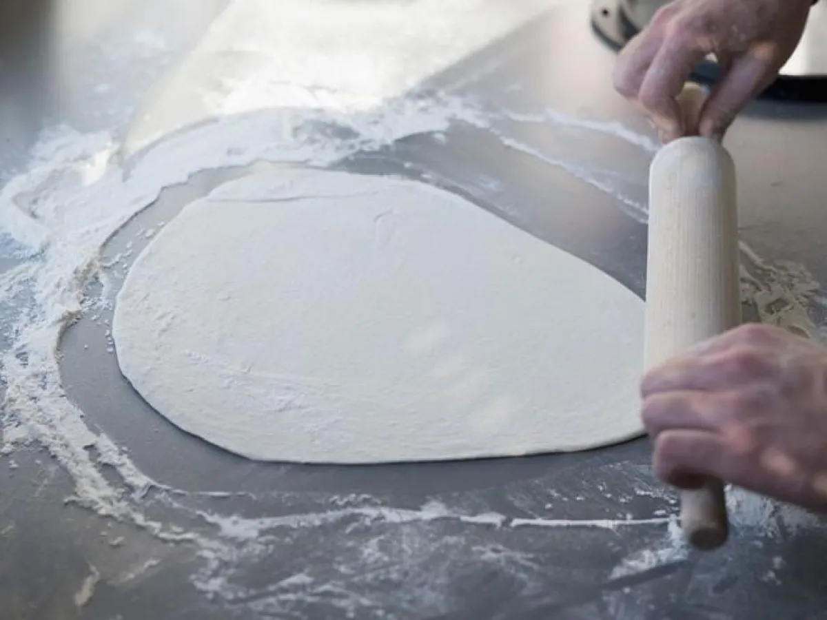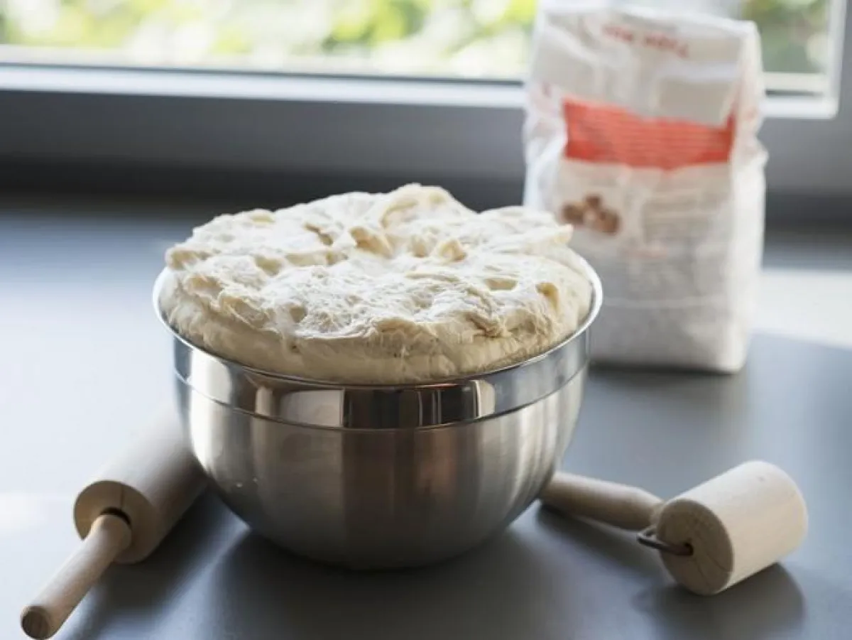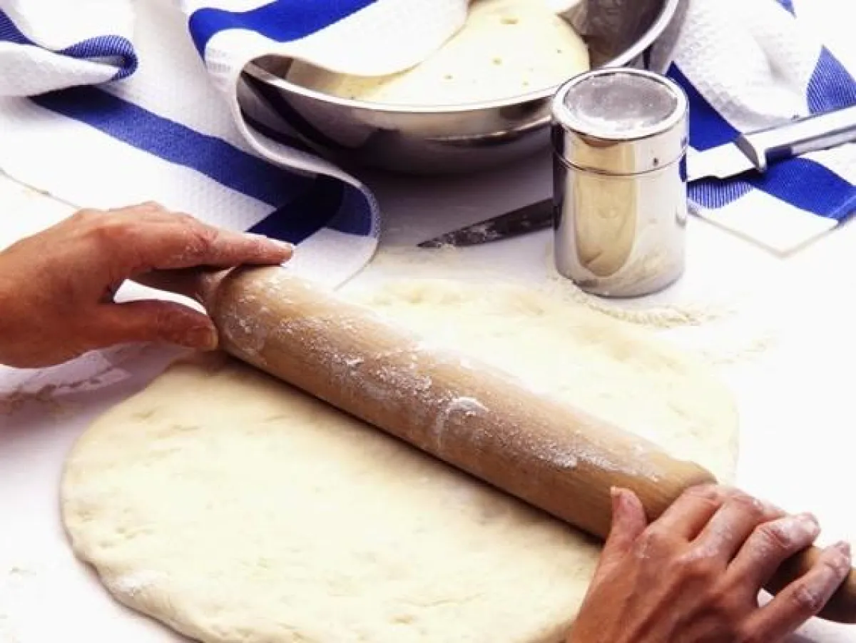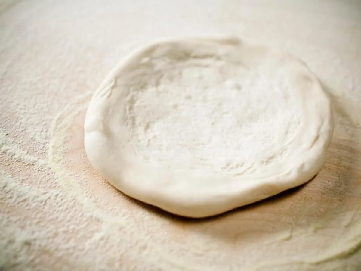 3- ترقّ العجينة مع القليل من الطحين على الطاولة، ثمّ تغطى بقطعة قماش وتدع لتختمر في مكان دافئ، لمدة 45 دقيقة.