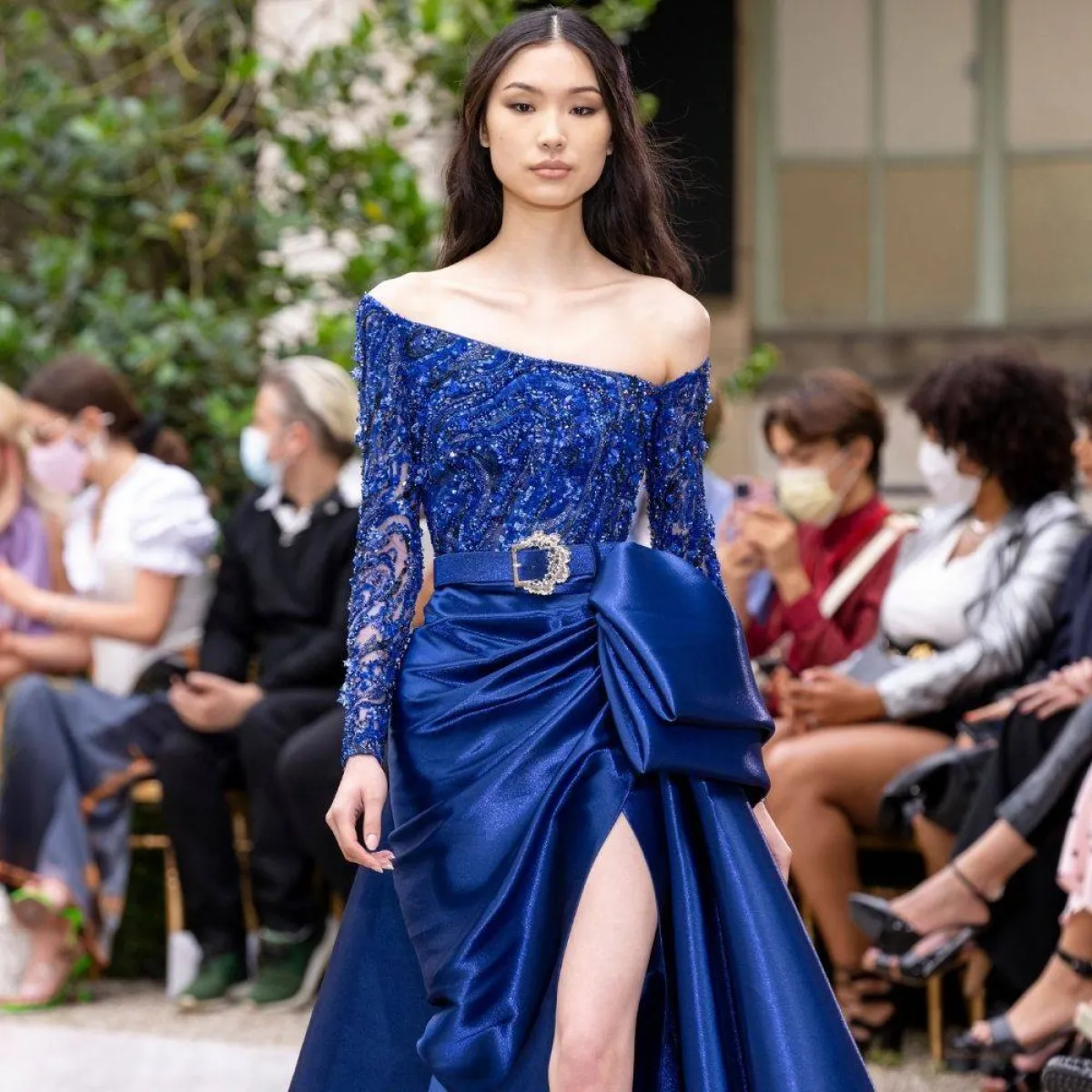للمرأة صاحبة الأسلوب الجذاب والأنيق اخترنا لكِ هذا الفستان من دار زهير مراد Zuhair Murad المصمم من قماش الساتان باللون الأزرق، وجاء بالدانتيل المُرصع بالخرز الأزرق، وصُمم بقصّة الأوف شولدرز وأكمام من الدانتيل المزين بالكامل بالخرز اللامع والأزرق، وصُممت تنورة الفستان بشكل جذاب وطويل من قماش الساتان مع فتحة أمامية كبيرة تكشف إحدى الساقين، وقطعة قماش إضافية من ساتان الكشكش على جانبي الخصر مع حزام عريض وإبزيم أنيق مطلي بالألماس اللامع.