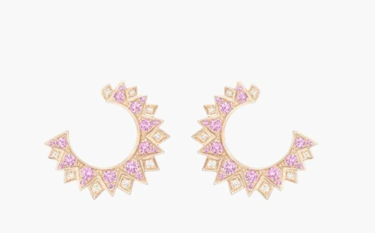 لتصميم أكثر نعومة يناسب العروس الرومانسية الهادئة، يُمكنكِ الاستعانة بأقراط Piaget Sunlight من بياجيه Piaget، والتي صُممت من الذهب الوردي عيار 18 قيراط، وجاءت مرصعة بـ 18 ماسة قطع بريانت (حوالي 0.09 قيراط)، و 36 ياقوت وردي (حوالي 0.62 قيراط)، لإطلالة ناعمة وراقية للعروس.