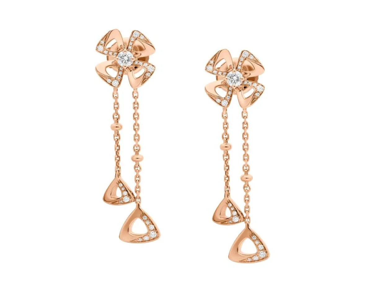 قدمت ماركة بلغاري Bvlgari العديد من التصاميم الراقية لأقراط ذهب وردي للعروس، أعجبنا منها هذا التصميم لأقراط Fiorever التي جاءت بتصميم مستوحى من الإلهام من زهرة بتلات الأربع الجذابة التي يعتز بها الرومان كرمز للسعادة والفرح.