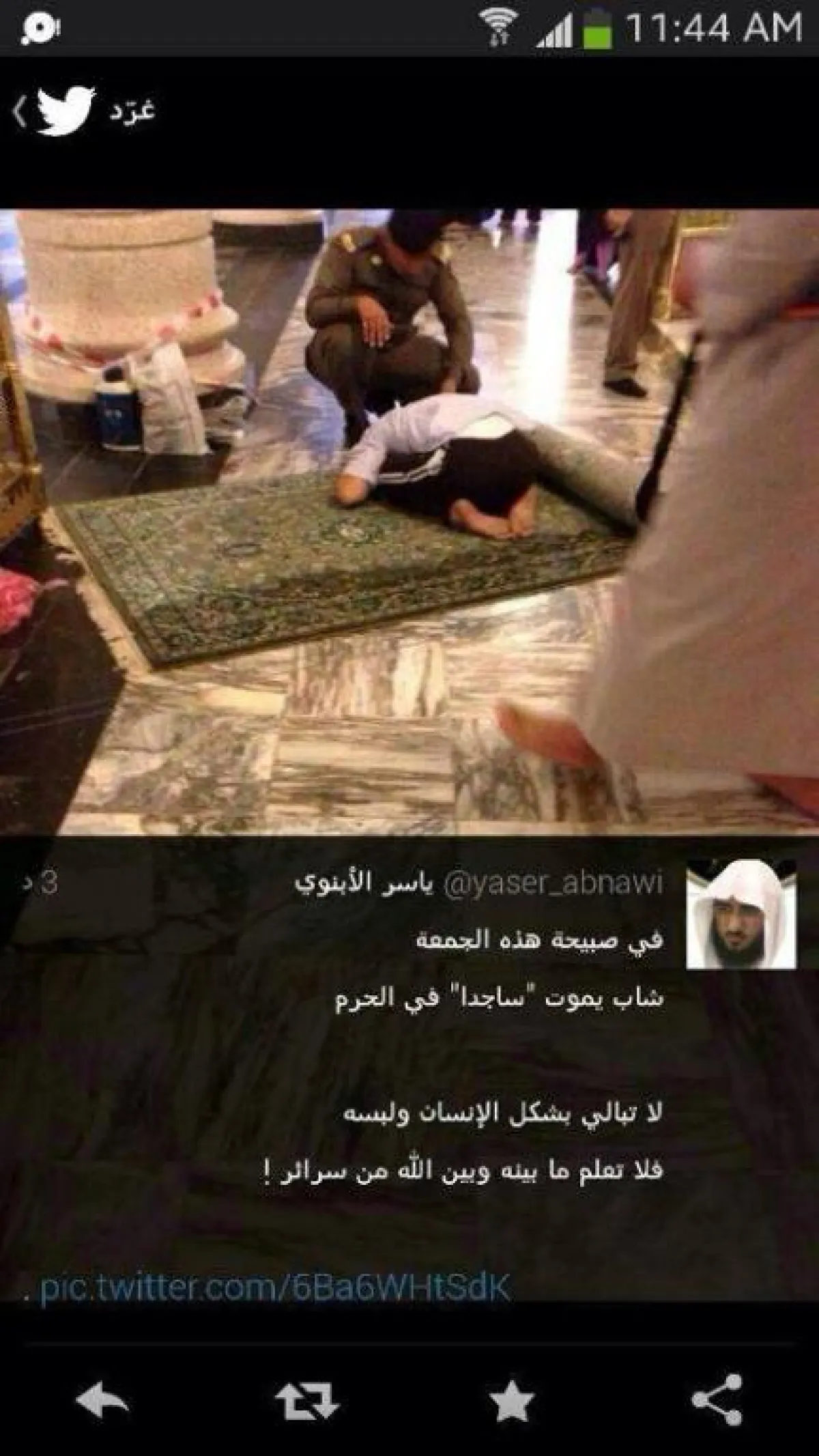 انتشرت بسرعة البرق عبر مواقع التواصل الاجتماعي و"الواتس أب" صورة لشاب يرتدي ملابس رياضية ويموت ساجداً في الحرم الشريف يوم أمس الجمعة، وقد أرفقت الصورة بمقاطع مؤثرة حول حسن الخاتمة، وضرورة العمل الصالح والكسب الحسن حتى ينال المسلم رضا الله ويحظى بخاتمة حسنة، إلا أن الحقيقة التي أعلنتها شرطة الحرم المكي أنه لم يتم تسجيل أي حالات وفاة داخل الحرم يوم الجمعة، وأن الشاب الذي تم تصويره وهو في وضعية سجود ثابتة لم يكن سوى شاب غلبه التعب والنوم فنام على هذه الوضعية، وما كان من المارة إلا أن قاموا بتصويره، وتداول الصورة على أنها دلالة حية على حسن خاتمة هذا الشاب، الذي لو قام أحدهم بوكزه بدلاً من تصويره لكان استيقظ.
