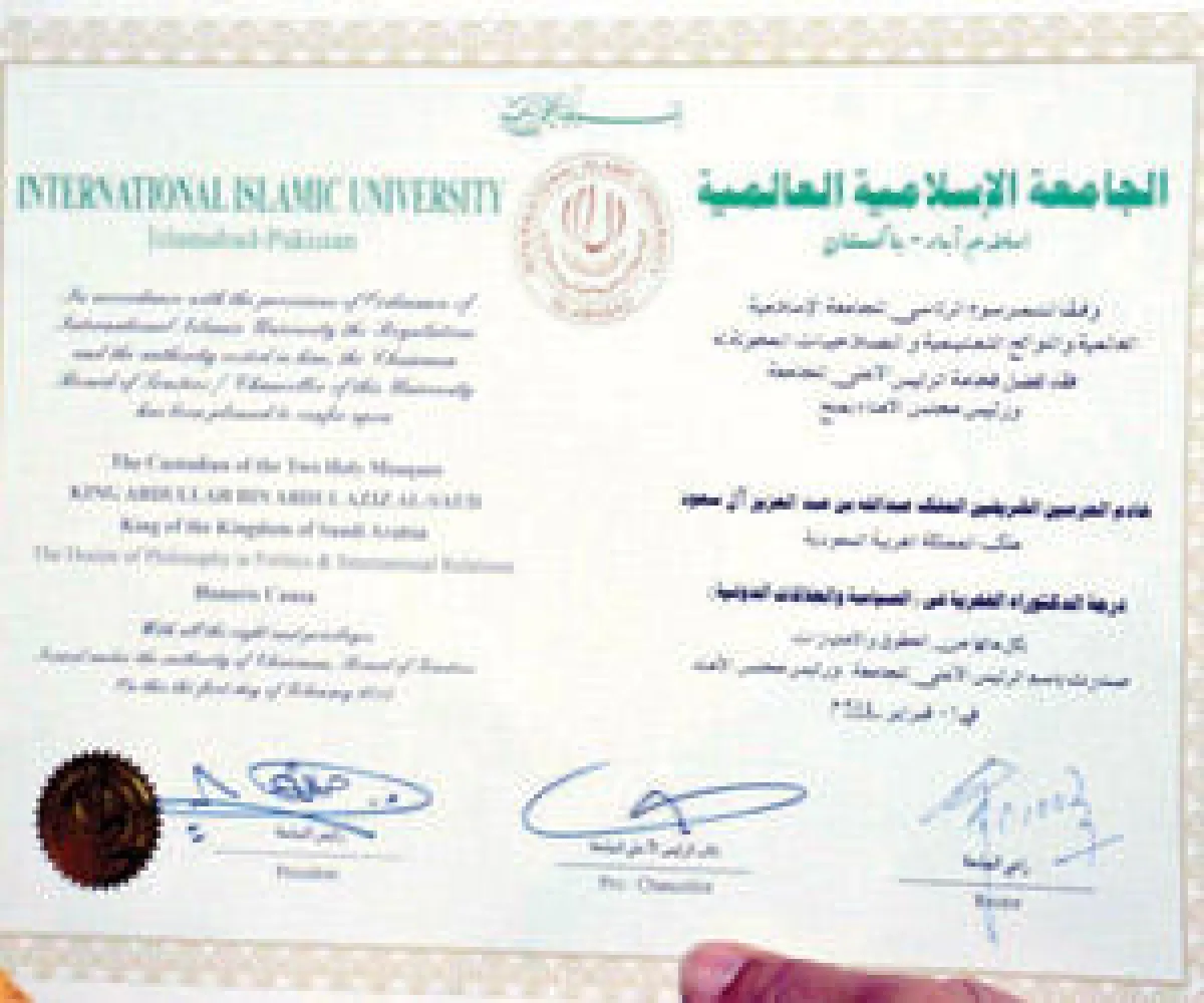 منحت الجامعة الإسلامية العالمية في إسلام أباد شهادة الدكتوراه الفخرية "في السياسة والعلاقات الدولية" لخادم الحرمين الشريفين الملك عبد الله بن عبد العزيز، اعترافاً وتقديراً من الجامعة للدور الريادي الذي يقوم به على المستوى الدولي والإقليمي، وعلى مستوى الأمة الإسلامية لتحقيق الأمن والاستقرار والوئام.