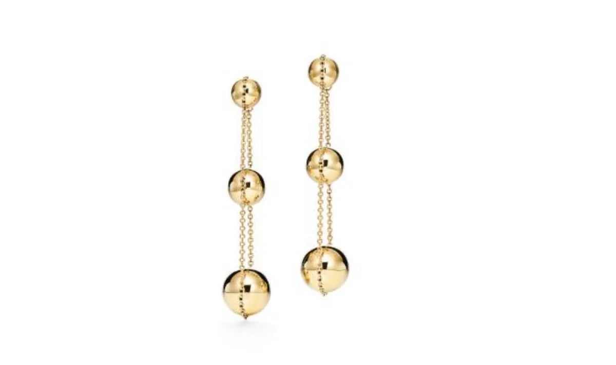 تُفضل الكثير من الفتيات الأقراط الطويلة، لذا نرشح لكِ هذا التصميم العصري من ماركة تيفاني آند كو Tiffany & co، لأقراط Triple Drop، المُصممة من الذهب الأصفر عيار 18 قيراطًا، على كل سلاسل رفيعة تتدلى منها 3 كرات بأحجام مختلفة، لإطلالة عصرية جريئة تخطف الأنظار.
