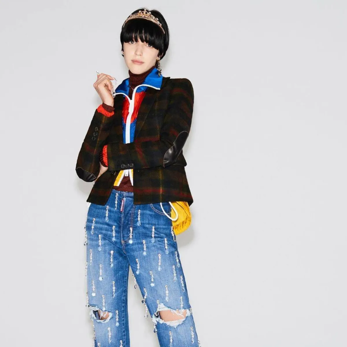 تحب معظم الصبايا ارتداء السروال المميز وغير التقليدي، لذا فقد يمكنك الاستعانة بهذا التصميم من علامة ديسكويرد2 Dsquared2 لسروال جينز مزيّن بالكامل بقماش باللون الأبيض وجاء مقطعاً عند الركبتين بأسلوب كاجوال وأنيق، ويمكنك اختيار معه جاكيت قصير باللون الأسود أو سوتيشرت باللون البني الفاتح، وارتدي معهما حذاء طويلاً من الجلد بكعب عالٍ باللون الأبيض وحقيبة كتف كبيرة باللون الأصفر.