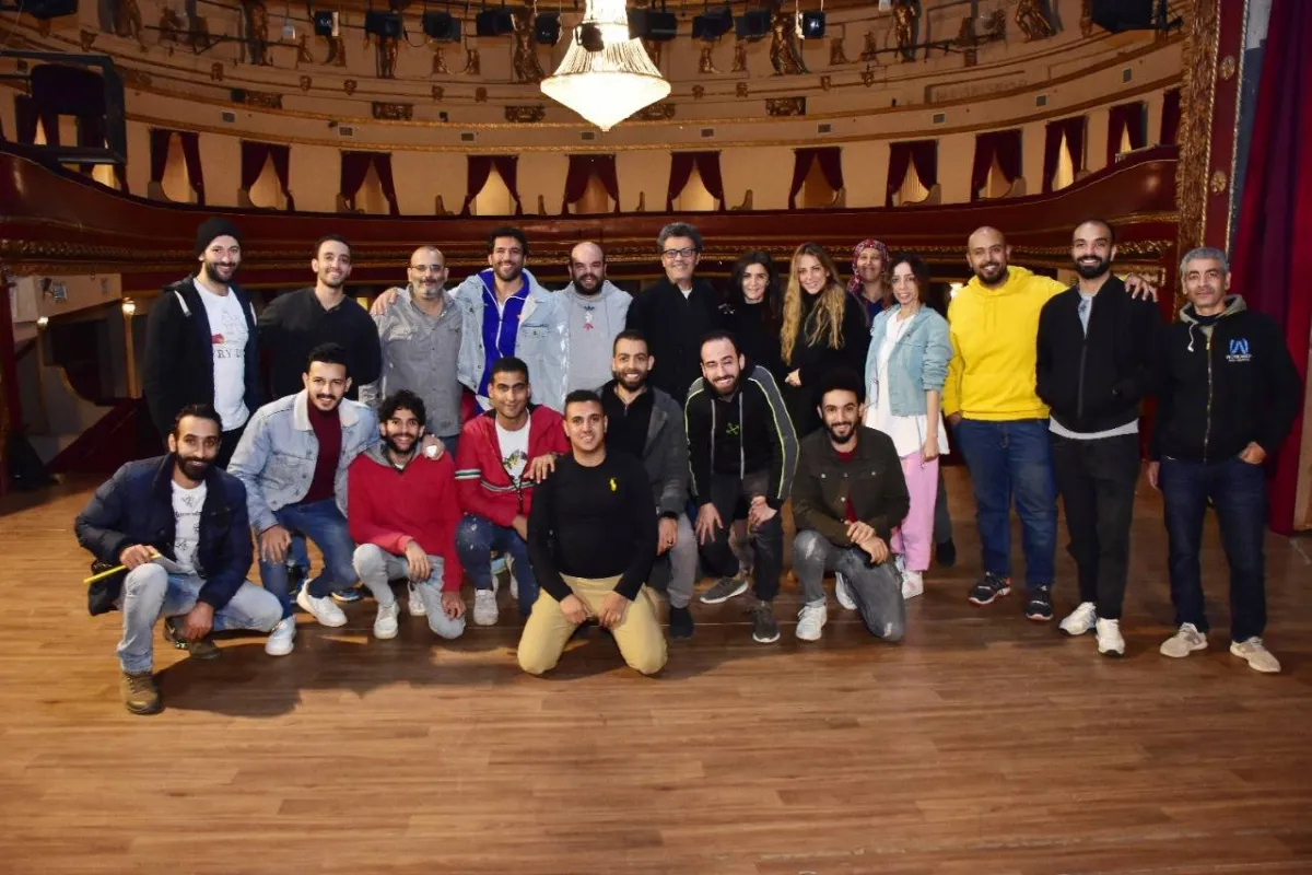 غادة عادل وحسن الرداد ومحمد عبد الرحمن وأيمن بهجت قمر في البروفات التحضيرية للمسرحية قبل عرضها - الصورة من المسؤول الإعلامي للمسرحية
