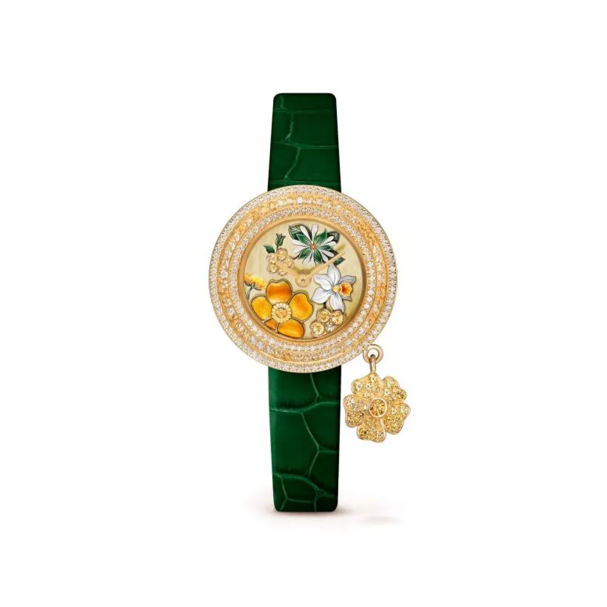 ميناء الساعة جاء مصنوعًا من عرق اللؤلؤ الذهبي الملون، عشب صوص مصغر مطلي، ونرجس صغير مطلي على عرق اللؤلؤ المنحوت، إضافة إلى خلفية حوذان مطلية بشكل مصغر على اليسار، و مرصعة بالأحجار الكريمة، وتاج من الذهب الأصفر والألماس الدائري، فيما صُمم سوار الساعة من جلد التمساح الأخضر مع إبزيم دبوس من الذهب الأصفر.