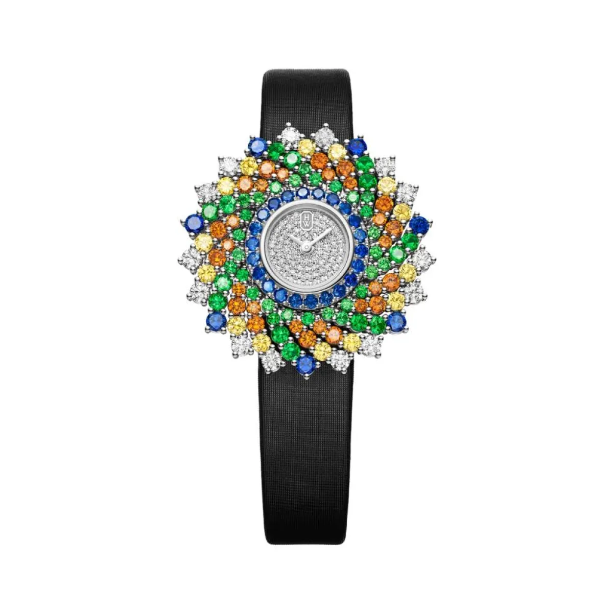 بتصميم جذاب يشبه الوردة المتفتحة ذات الألوان الساحرة، قدمت ماركة هاري وينستون Harry Winston ساعة Winston Kaleidoscope، المُصممة من علبة دائرة مرصعة بـ 42 حجر تسفوريت لامع، و29 حجر ياقوت أزرق مقطوع بطريقة بريانت، و28 سبيسارتيت برتقالي مقطعة بريانت، مع 14 ماسة قطع بريانت، و14 حجر ياقوت أصفر مقطوع بشكل لامع، فيما صُمم سوار الساعة من الساتان الأسود.
