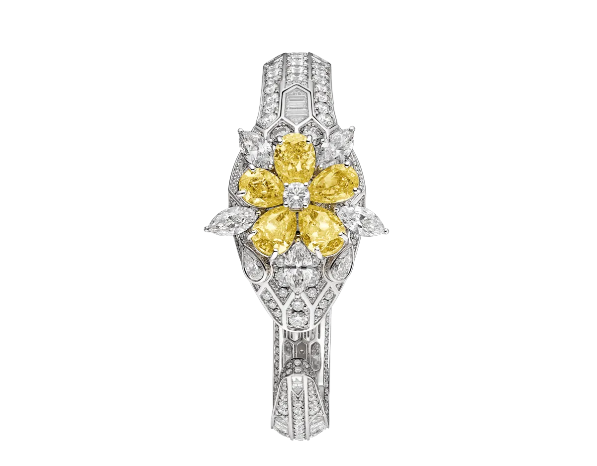 قدمت ماركة بلغاري Bvlgari العديد من التصاميم الجذابة لساعات مرصعة بالألماس الأصفر، أعجبنا منها هذا التصميم الساحر لساعة Serpenti Misteriosi Secret Watch التي صممت من علبة مغطاة برأس أفعى، حيث تلتف الساعة المتطورة والرائعة حول المعصم لتتألق بجمال الموازين الثمين وبتقلب حركاتها المميز، بينما تتوج رأس الثعبان الملكي بزهرة رائعة من الألماس الأصفر.