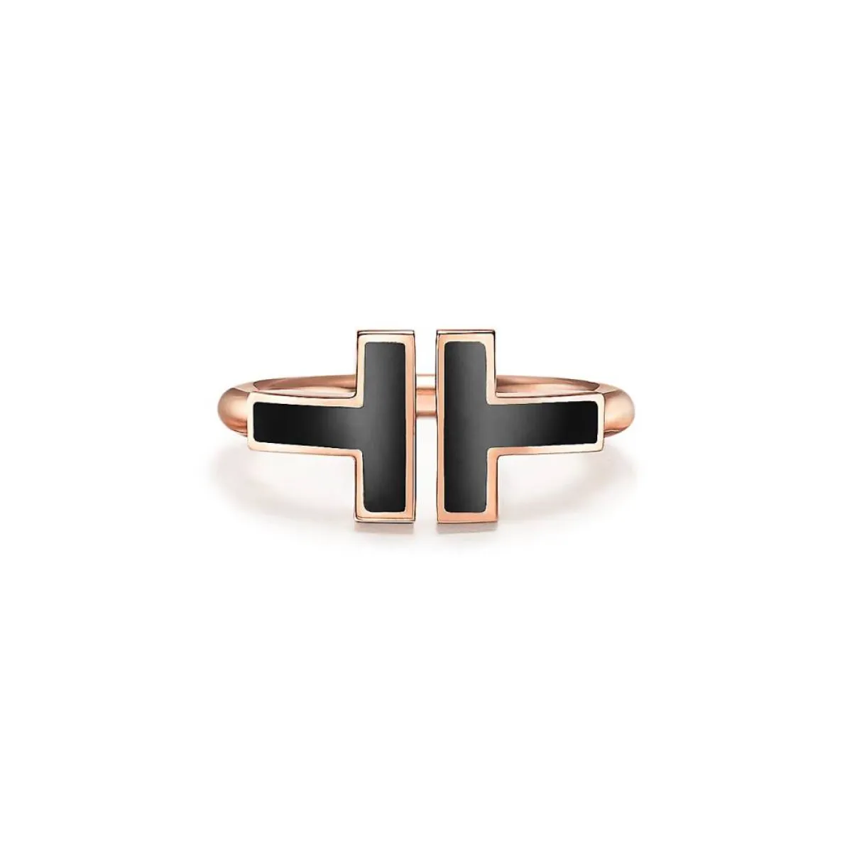 يتميز هذا الخاتم من دار تيفاني أند كو Tiffany&Co بتصميمه "T" الجريء مع حجر أونيكس أسود ، وهو نوع فريد من الكوارتز الموجود في الطبيعة ، هذا التصميم الحديث يلفت الأنظار بلمسة نهائية ناعمة وصقل عالي. نظرًا لأنها متعددة الأوجه ومميزة ، فإن مجموعة Tiffany T من أكثر الموديلات الرائجة وقد صمم الخاتم بطريقة  تصميم مفتوح بالذهب الوردي عيار 18 قيراطاً ومرصع بحجر الأونيكس الأسود .