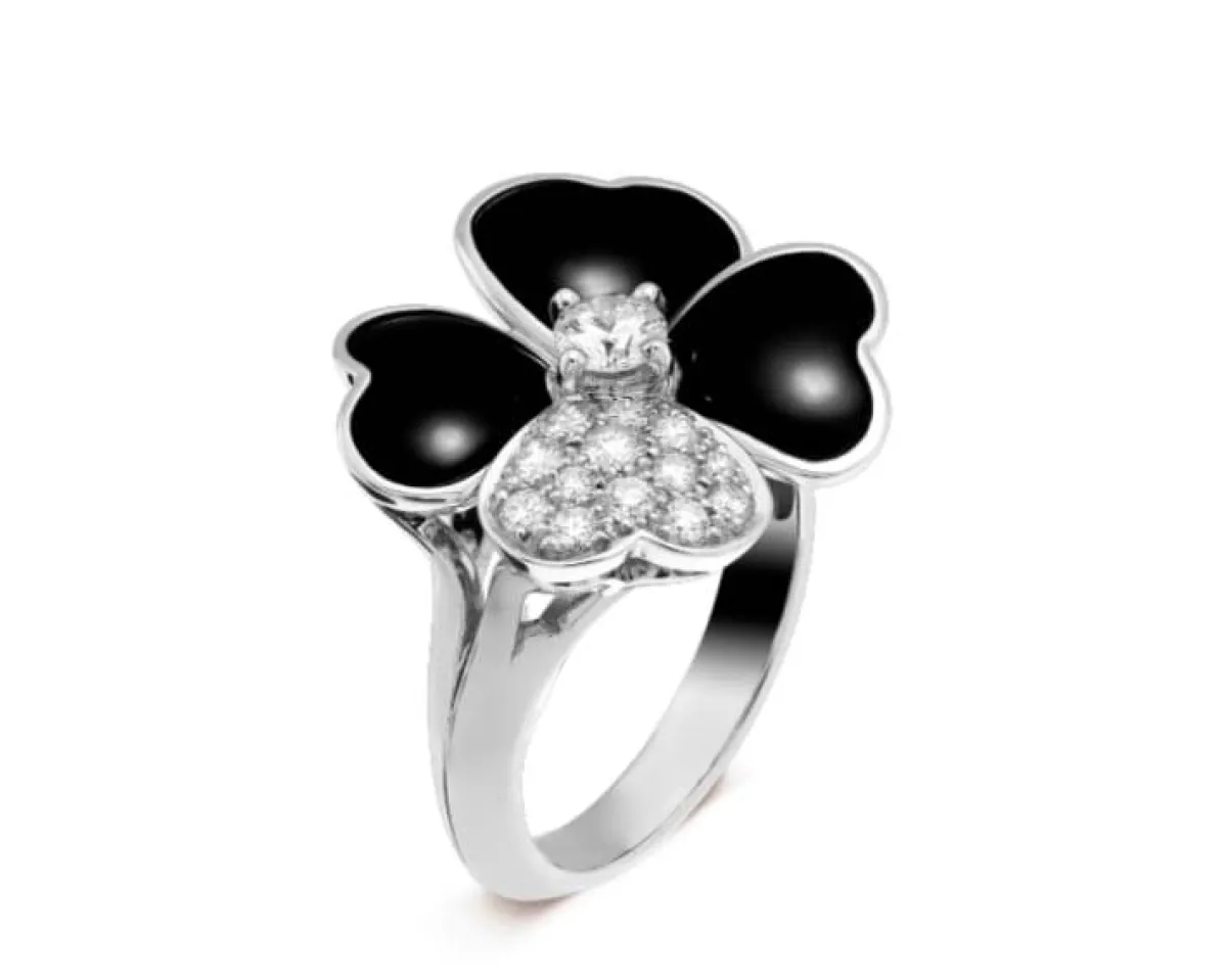 قدمت دار فان كليف أند آربلز Van cleef &Arpels هذا التصميم الفخم لخاتم مصمم من الذهب الأبيض عيار 18 قيراطاً وجاء على شكل قلوب مرصعة بأحجار الأونيكس الأسود وقلب مرصع بالألماس الأبيض اللامع مع مركز الألماس الدائري وفصوص الماس البراقة .