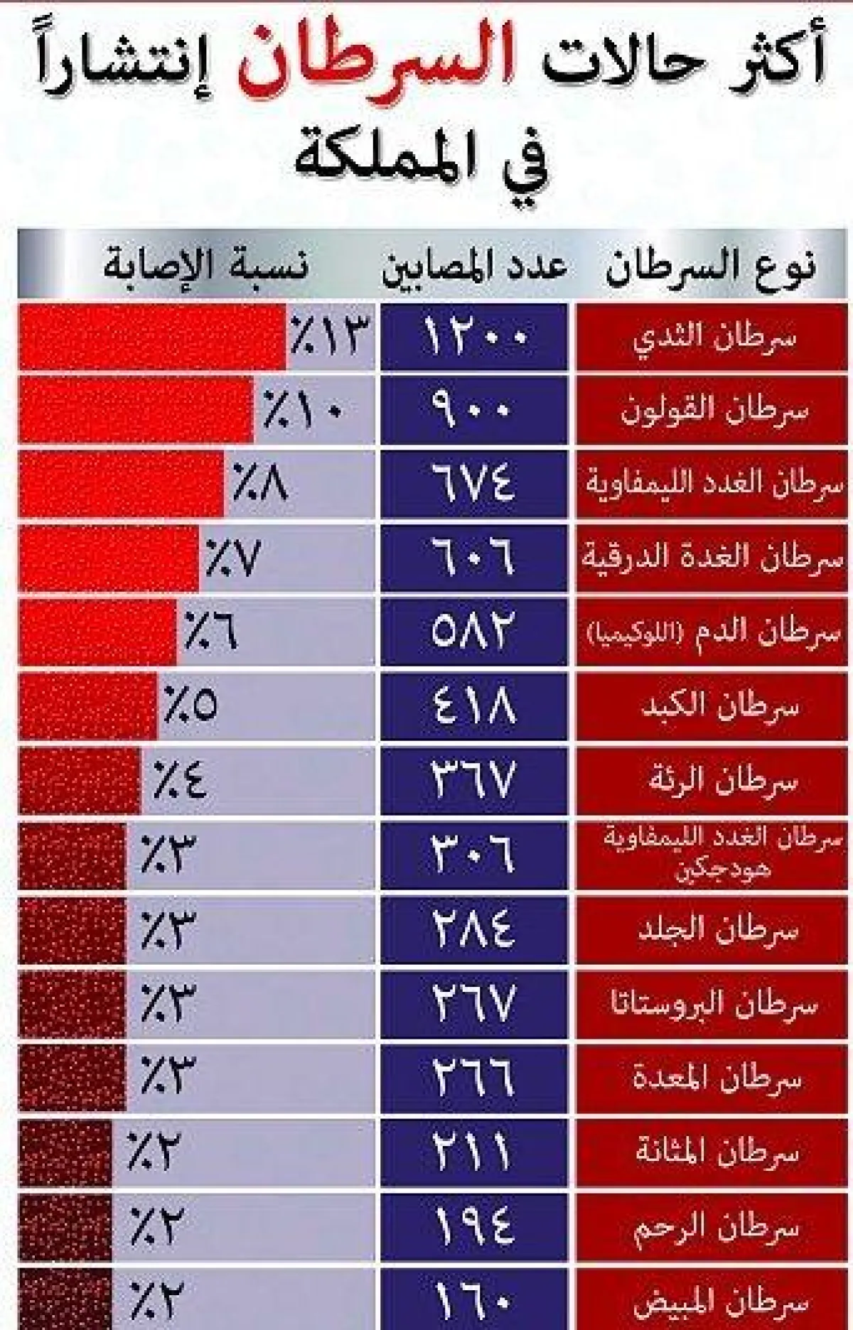 أرقام مرعبة ومقلقة تلك التي جاءت في أحدث إحصائيات صدرت عن وزارة الصحة السعودية عن حالات الإصابة بالسرطان في المملكة، إذ أشارت إلى أنّ عدد الحالات المبلغ عنها حسب السجل السعودي للأورام لعام 2009 بلغ 13254 حالة، بمعدل حدوث 85.5% حيث يعد سرطان الثدي السرطان الأكثر شيوعًا على مستوى المملكة عند النساء، يليه سرطان القولون والمستقيم، ومن المتوقع أن تتضاعف حالات السرطان بحلول عام 2020، وتصبح ثلاثة أضعاف بحلول عام 2030، وأن يتواصل ارتفاع عدد الوفيات الناجمة عنه، لذا لا بد من اتخاذ تدابير حاسمة للحد من الوفيات المبكرة، ورفع مستوى الوعي حول هذا المرض الذي يعد من أهم الأسباب الرئيسة للوفاة في جميع أنحاء العالم، خاصة وأنّ معدلات الشفاء تتفاوت بين الدول المتقدمة والنامية ذات الدخل المنخفض والموارد القليلة، مع افتقاد القرار السياسي العادل لتوفير العلاج المجاني أو بأسعار زهيدة لجميع مرضى السرطان؛ حيث إنّ أكثر من 70% من الوفيات من السرطان في العالم في الدول النامية.