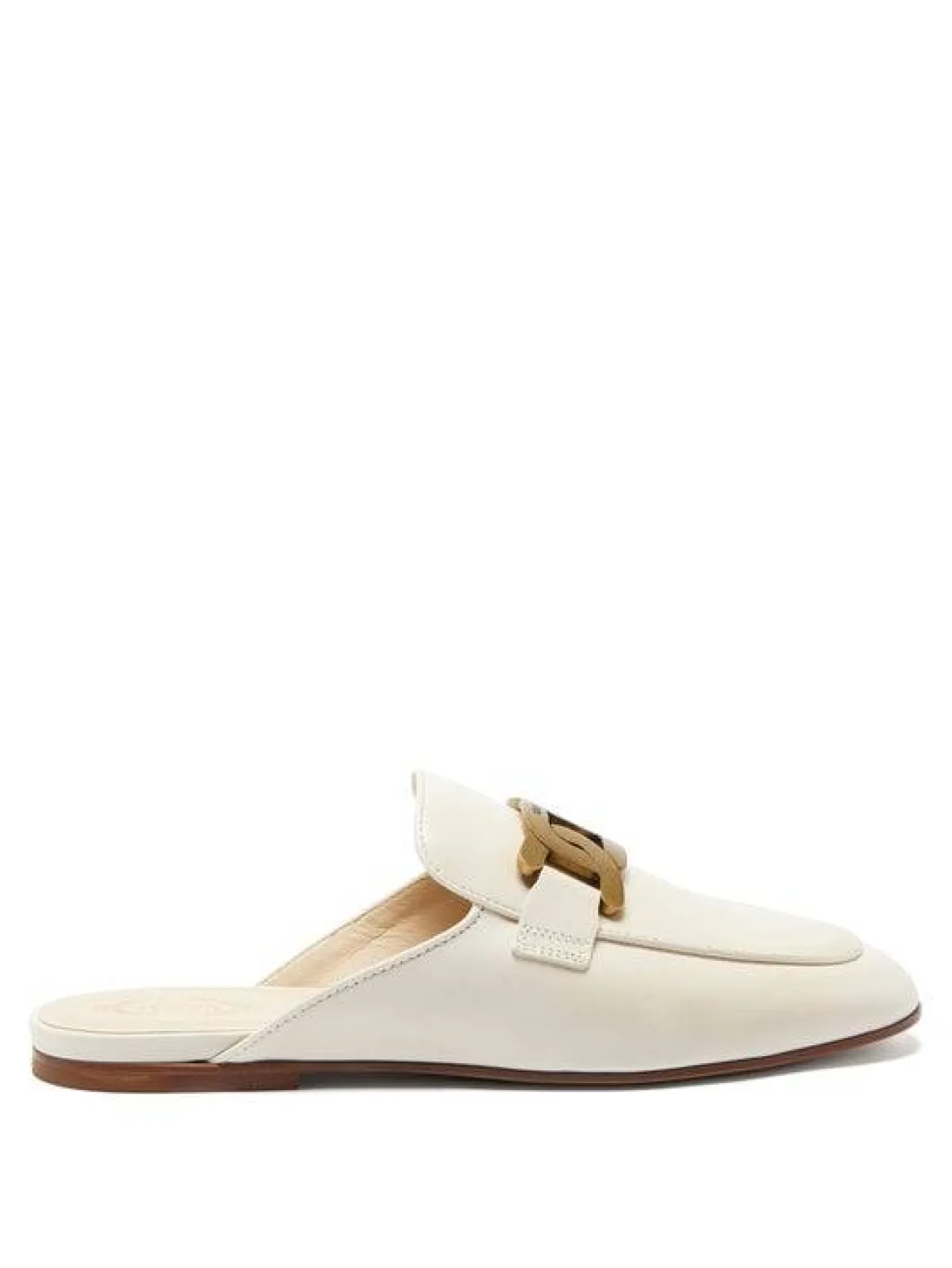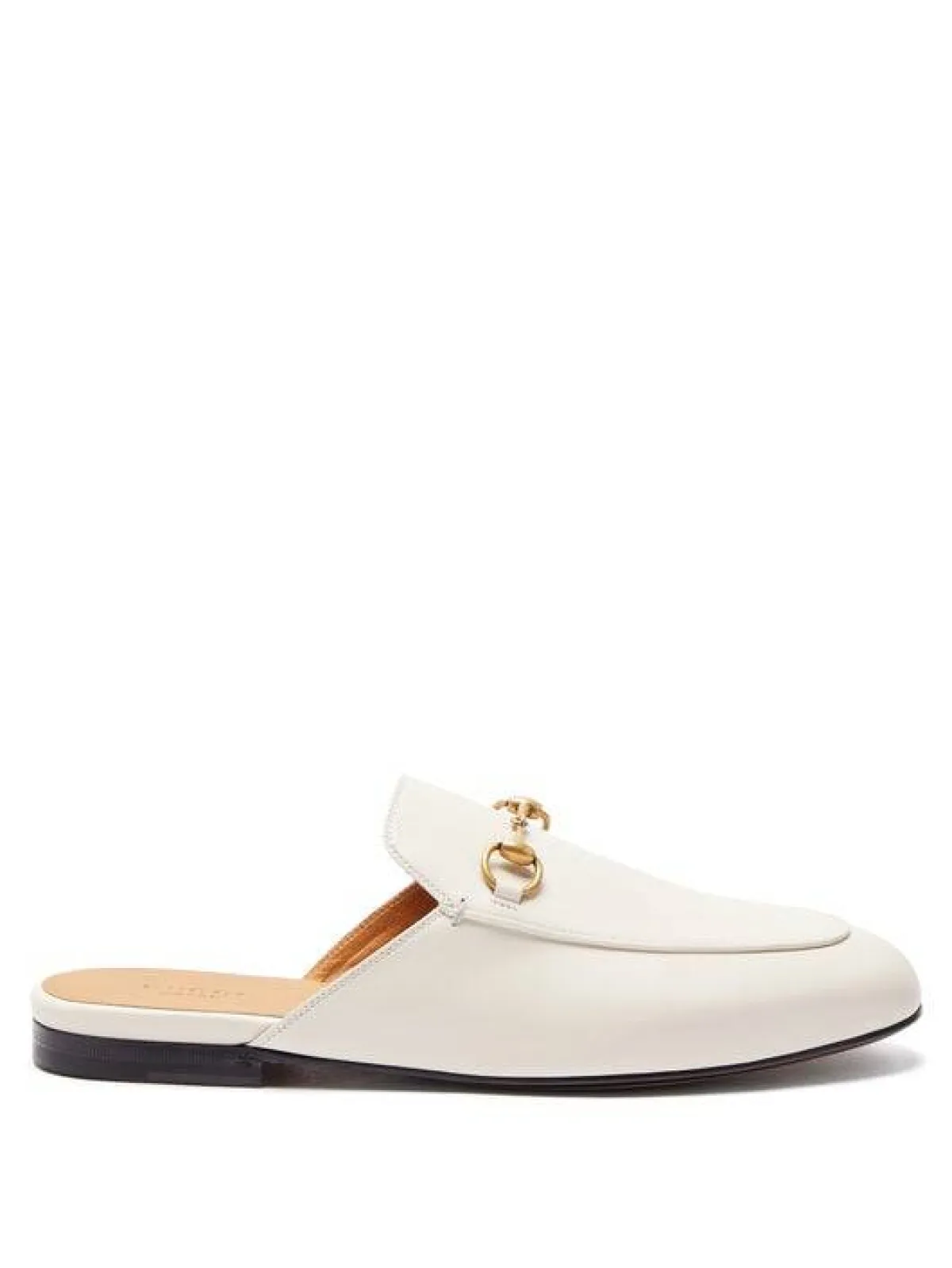 علامة غوتشي Gucci المعروفة بتصاميمها الكلاسيكية الفاخرة، قدّمت حذاء مول مصنوعاً من الجلد باللون الأبيض ومزيّناً بقطعة معدنية باللون الذهبي تعكس شعار العلامة.
