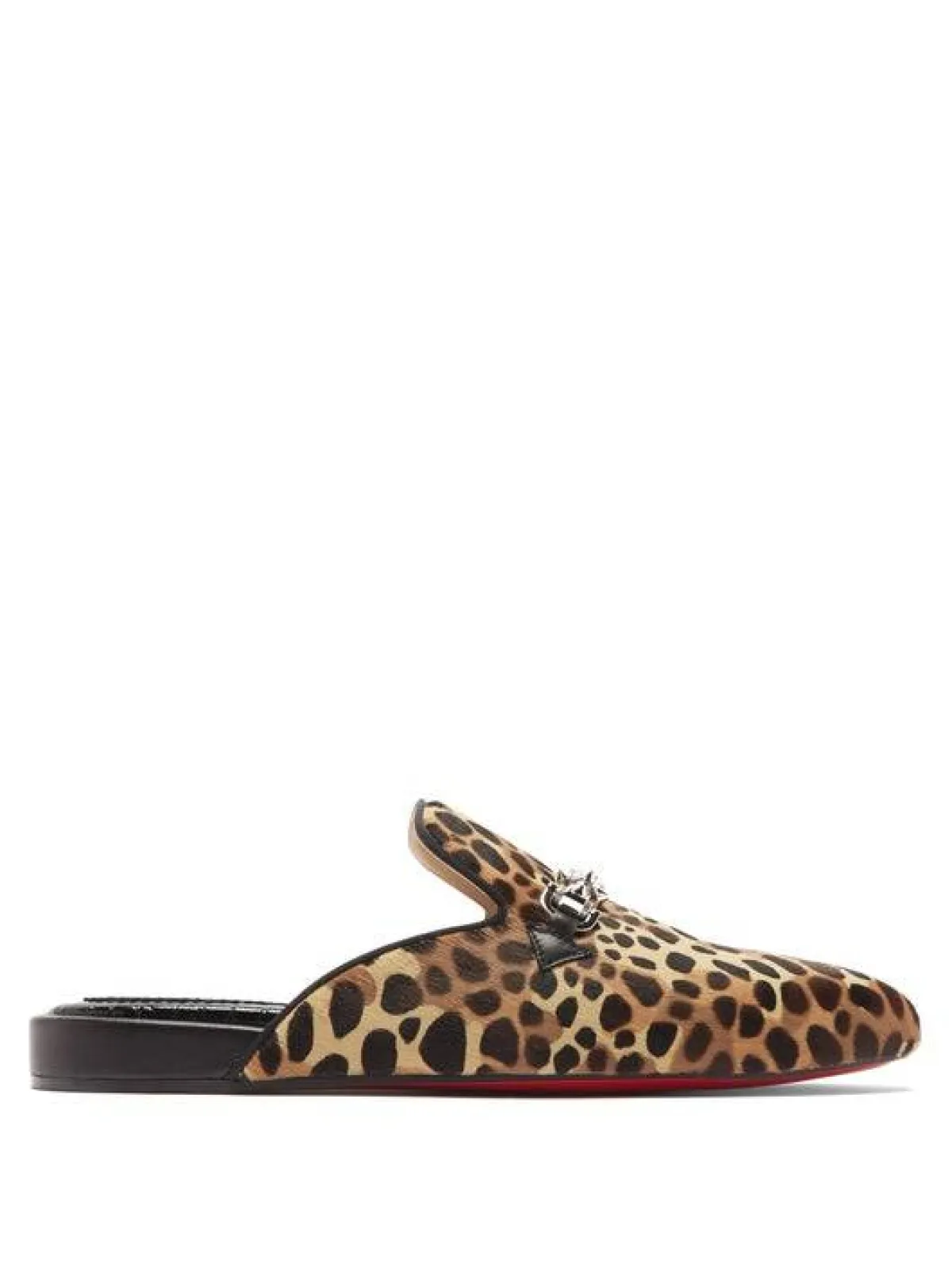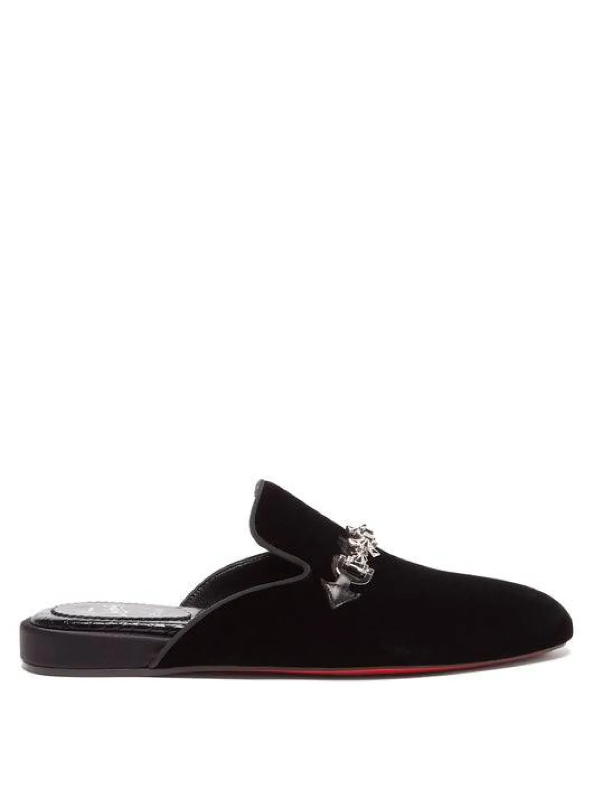 ومن قماش المخمل الغني قدّمت علامة كريستيان لوبوتان Christian Louboutin حذاء مول باللون الأسود تزيّنه قطعة معدنية باللون الفضي.