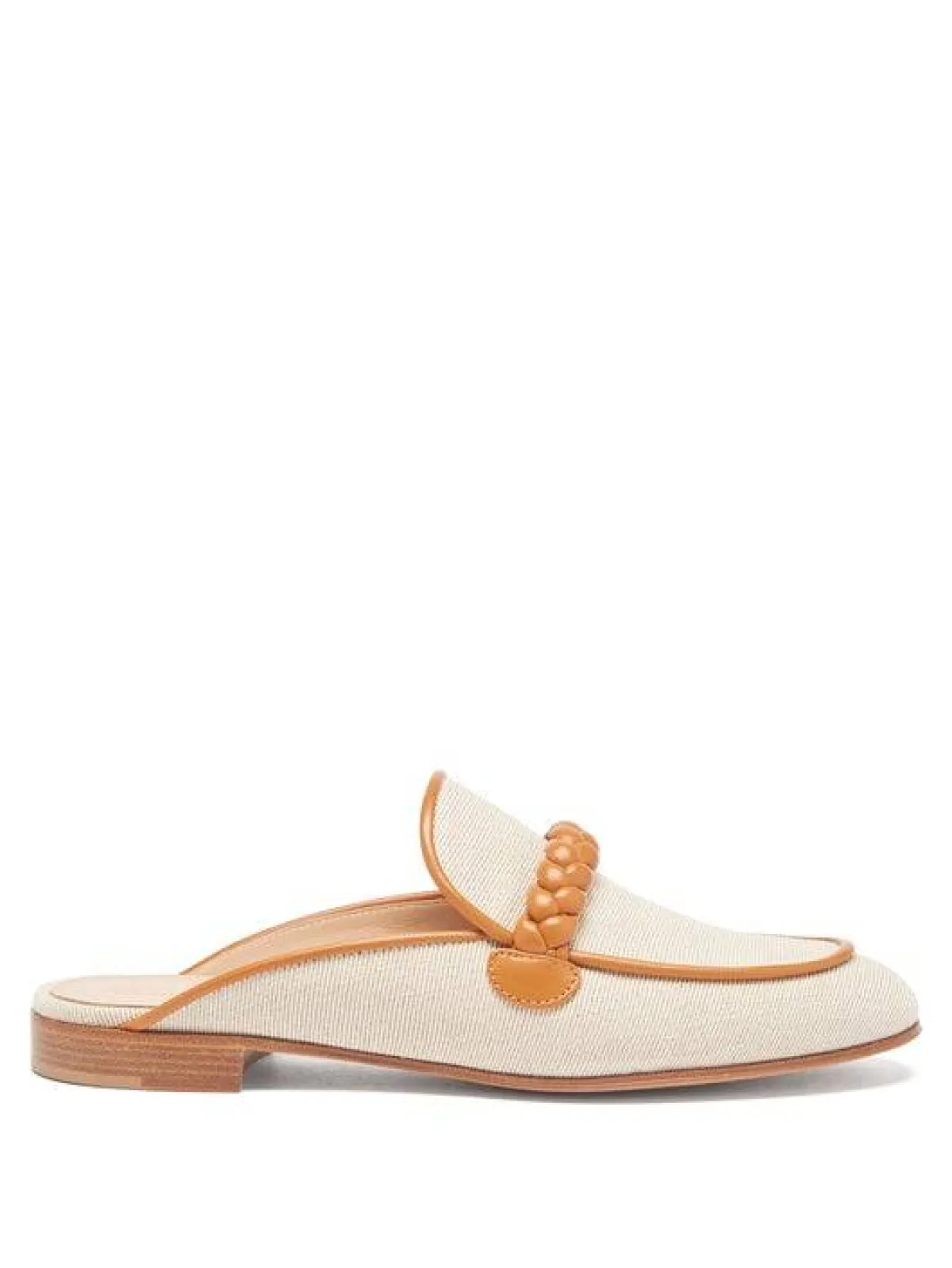 بدورها صمّمت علامة جيانفيتو روسي Gianvito Rossi حذاء مول مصنوعاً من القماش باللون الأبيض تزيّنه قطع جلدية باللون الهافان.