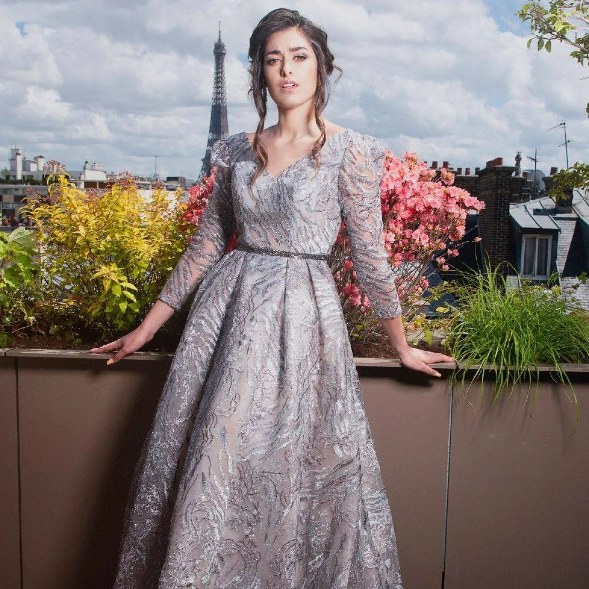 لوالدة العروس الأنيقة والجذابة اخترنا لكِ هذا التصميم من علامة كريستوف غيلارمي Christophe Guillarmé لفستان مصمم من الدانتيل باللون الرمادي وجاءت الأكمام طويلة مصنوعة بالدانتيل اللامع باللون الرمادي والأكتاف المنفوشة بقصّة أنيقة وعصرية، أما التنورة فقد صُممت بأسلوب منفوش كلاسيكي وذيل طويل منسدل مع الكسرات الأمامية البارزة عند الخصر، وجاء الفستان مُرصعاً بالخرز اللامع والاستراس الرمادي، ويمكنك تنسيق حزام رفيع من الجلد باللون الأسود اللامع، حتي تكتمل إطلالتكِ.