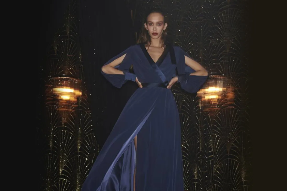 لوالدة العروس التي تحب الأزياء المحتشمة اخترنا لكِ هذا الفستان من علامة ألكسيس مابيل Alexis Mabille المصمم باللون الأزرق الداكن وجاء بأكمام طويلة ضيقة ومفتوحة وياقة عريضة وطويلة من قماش الساتان باللون الكحلي مع فتحة الصدر الأمامية على شكل V، وصُممت التنورة بأسلوب طويل وفتحة أمامية كبيرة تكشف أحد الساقين أما الخصر فقد صُمم بشكل ضيق.