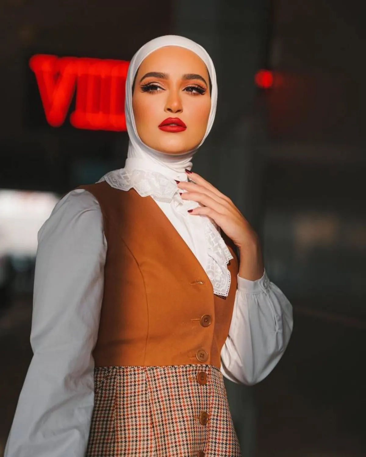 بإمكانك أن تستوحي من دلال الدوب مكياجاً جريئاً ودافئاً في الوقت نفسه، تعتمدين فيه ظل العين البني الفاتح فوق الجفن العلوي، مع الكحل البني المسحوب عند طرف العين وعند زاوية العين الخارجية، الى جانب طبقات عدة من الماسكرا. في المقابل، تقومين باستخدام أحمر الشفاه الجريء المات، مع تحديد الشفاه بقلم تحديد الشفاه باللون الأحمر نفسه. كما بإمكانك اعتماد الروج نفسه، لكن مع خطوط الأيلاينر الغرافيكية على خط الجفن العلوي وعند كسرة العين، مع ظل العين الفاتح واللامع.