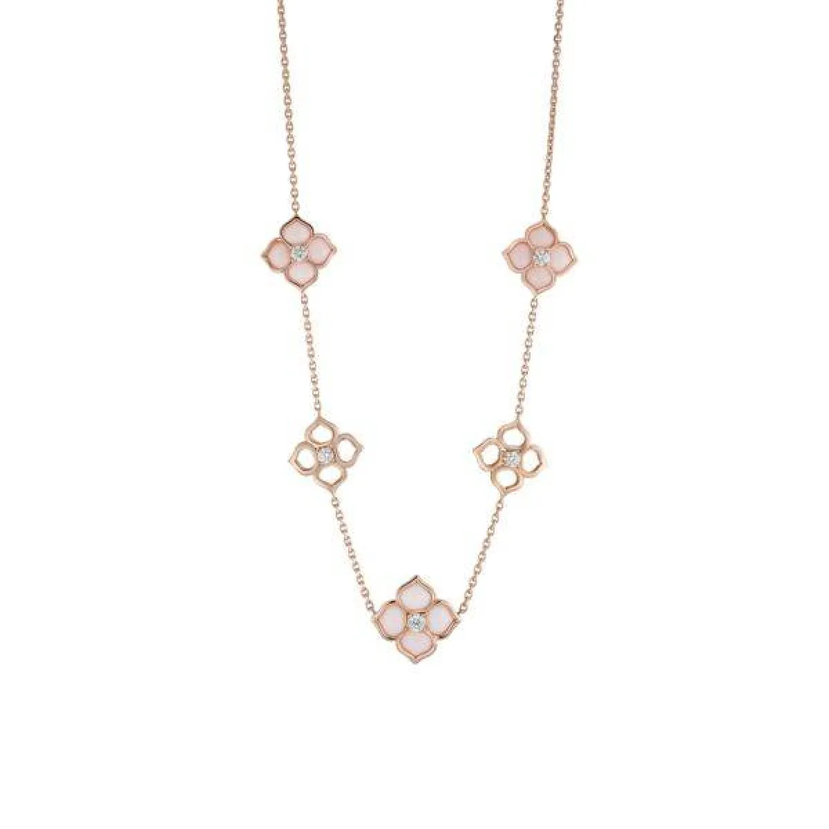 لإطلالة نهارية ناعمة وأنيقة، يمكنك ارتداء هذا التصميم من علامة شوبارد Chopard لسلسلة طويلة مصنوعة من الذهب الوردي عيار 18 قيراطاً ومرصعة بحجر الأوبال الوردي على شكل ورود ومرصعة بماسات لامعة وجاءت السلسلة بثلاثة وردات مصنوعة من حجر الأوبال الوردي واثنتين من الذهب الوردي المرصع بفصوص الماس البراقة.