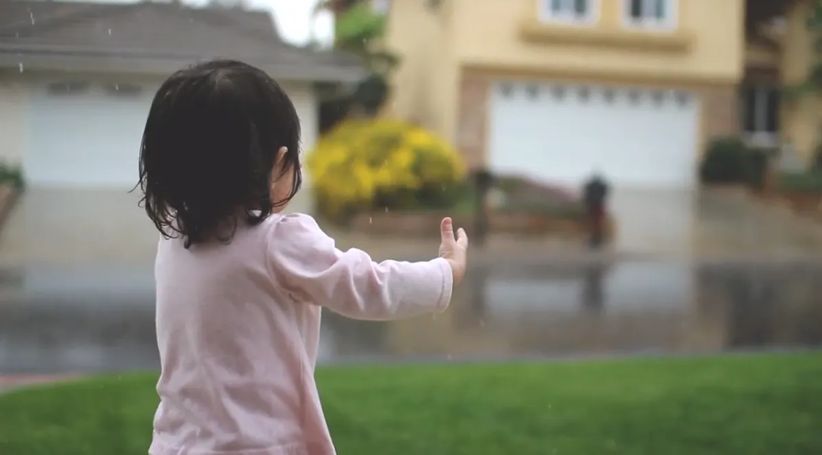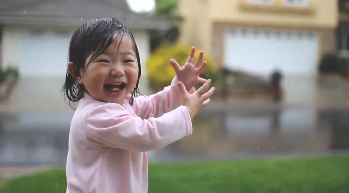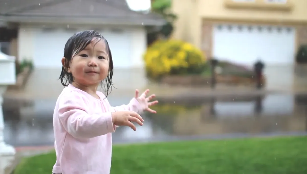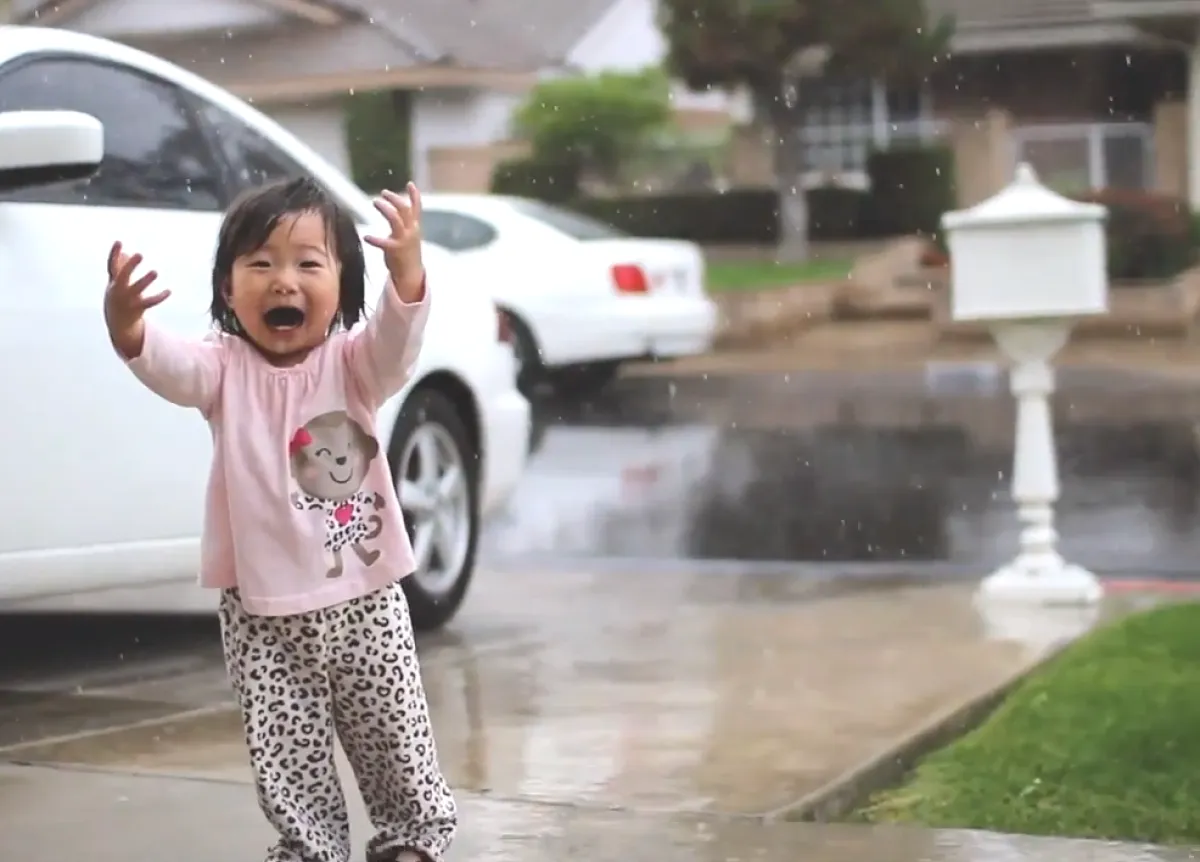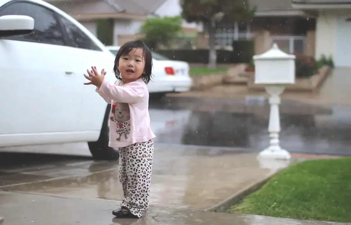 ووفقًا لـ"ديلي ميل البريطانية" فإنّ هذه كانت لحظات تاريخية في حياة الطفلة كاين، التي تبلغ من العمر 15 شهرًا بعد أن سمح لها والداها بالخروج من باب المنزل والسماء تُمطر في ولاية كاليفورنيا الأمريكية. وبعد أن رأت المطر لأول مرة في حياتها كانت في قمة السعادة وهي تشعر وكأنها تحصل على حمام طبيعي، وأخذت تصدر أصواتًا وحركات تدل على سعادتها البالغة، وأظهر الفيديو والدة الطفلة وهي تحاول لأكثر من مرة أن تدخلها للمنزل مرة أخرى بعدما تبللت ملابسها بشكل كامل، ولكن الطفلة كانت تصر على بقائها في الخارج.