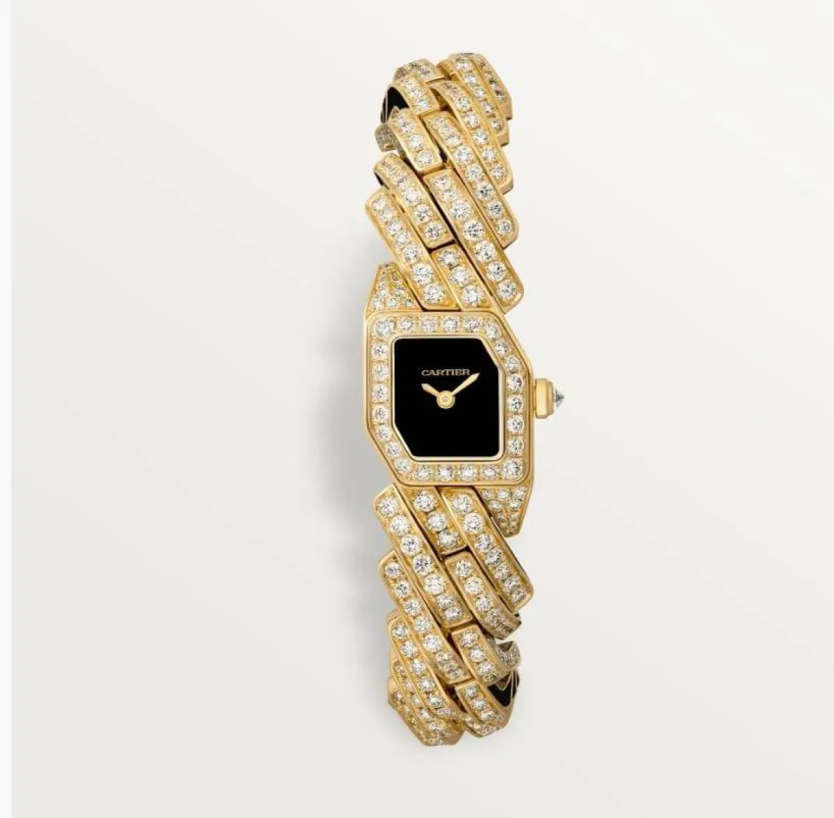 ساعة Maillon de Cartier من علامة كارتييه Cartier مصممة من الذهب الأصفر عيار 18 قيراطاً ومرصعة بالماس والورنيش، وجاءت علبة الساعة وتاج وسوار من الذهب الأصفر عيار 18 قيراطاً مرصع بـ 581 ماسة قطع بريانت، وعقارب من الفولاذ المطلي بالذهب على شكل سيف، وميناء مطلي بالورنيش الأسود، وحافة العلبة، وصممت الساعة بميناء داكن باللون الأسود ومرصعة بالألماس الأبيض اللامع حول الميناء والسوار.