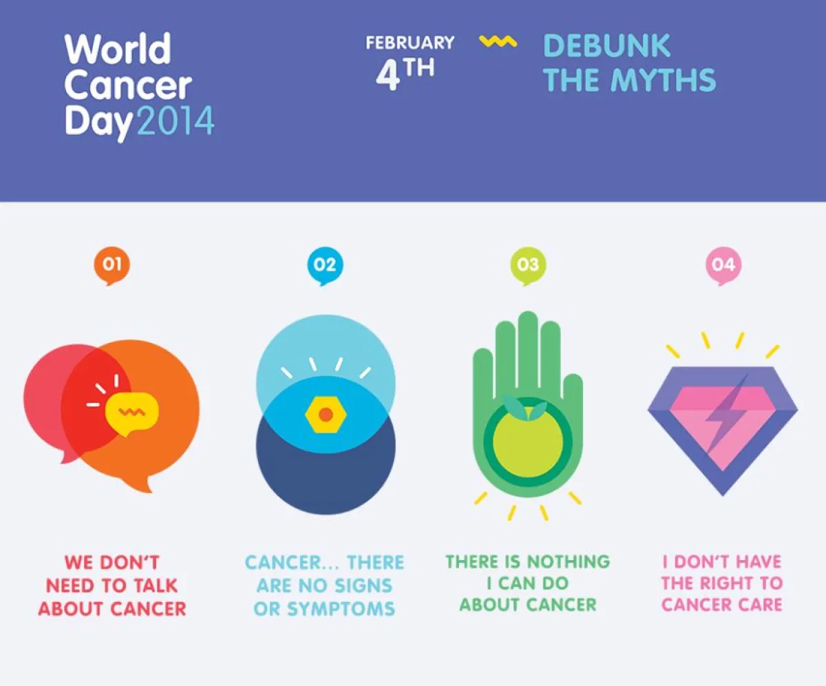 يشار إلى أنّ اليوم العالمي للسرطان يهدف هذا العام بحسب منظمة الصحة العالمية إلى تصحيح أربعة مفاهيم خاطئة انتشرت بين الناس حول مرض السرطان، كمعتقد أننا لسنا بحاجة للحديث عن السرطان لكن الحقيقة أنّ الصراحة في تناول هذا المرض يمكن أن تحسِّن التعامل معه بشكل علني قد يحسن النتائج العلاجية له، ومعتقد أنّ السرطان لا توجد له علامات أو أعراض، والحقيقة أنّ هناك العديد من العلامات والأعراض المنذرة للكثير من أمراض السرطان، والفوائد التي يحققها الكشف المبكر لا جدال حولها، ومعتقد إنني لا أملك الحق في الحصول على الرعاية الصحية اللازمة، والحقيقة أنّ كل الناس لهم الحق في الحصول على معالجات من السرطان وخدمات صحية موثوقة وفعَّالة على قدم المساواة ومن دون عناء.
