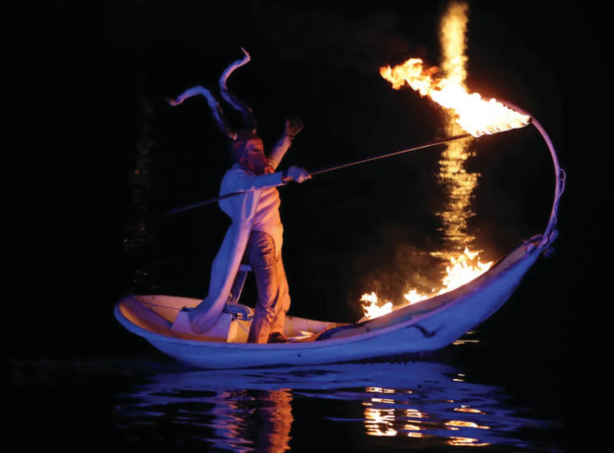 وينطلق يومياً موكب العرض في جولة بحرية من جزيرة العلم في تمام الساعة 8 مساء في بحيرة خالد، وصولاً إلى مقابل مبنى السوق المركزي ليبدأ العرض المميز في تمام الساعة 9 ويستمتع زوار المهرجان بتجربة فريدة بالأضواء والألوان.