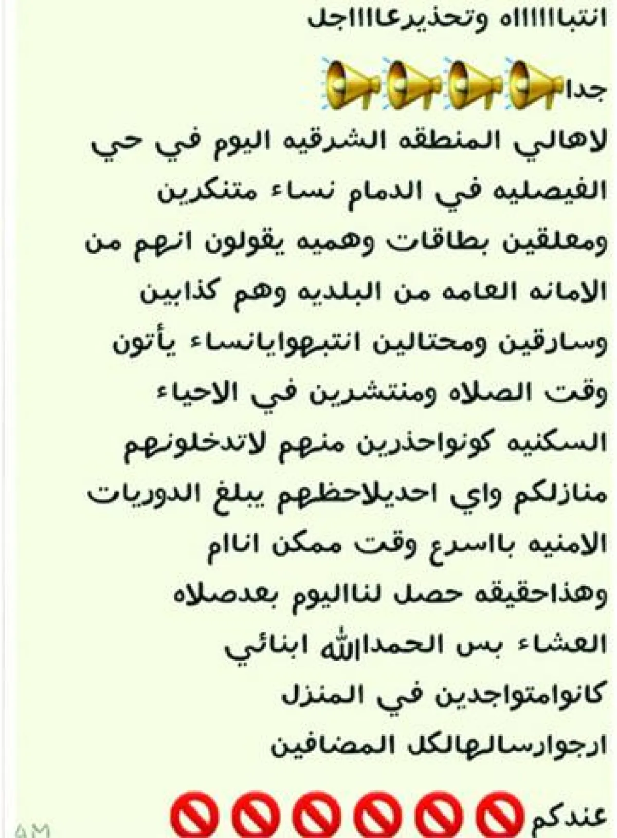 ووفقاً لـ"عكاظ" زارت سيدات بعض المنازل في مدينة الدمام، بعد طرق أبوابها، وطلبن الدخول، مدعيات أنهنّ ينتمين إلى "أمانة منطقة الشرقية" ويحملن بطاقاتٍ خضراء، ما جعل أصحاب المنازل يطمئنون ويسمحون لهنّ بالجلوس، ويعطونهنّ المعلومات التي يحتجنها. وكانت المعلومات شبيهة بما يطلبه موظفو «التعداد السكاني»، بحسب ما ذكر بعض الأهالي، إذ كانت الأسئلة تركز على عدد أفراد العائلة، وأسئلة حول ما يحويه المنزل من أجهزة إلكترونية، إضافة إلى الدخل الشهري لربّ الأسرة.