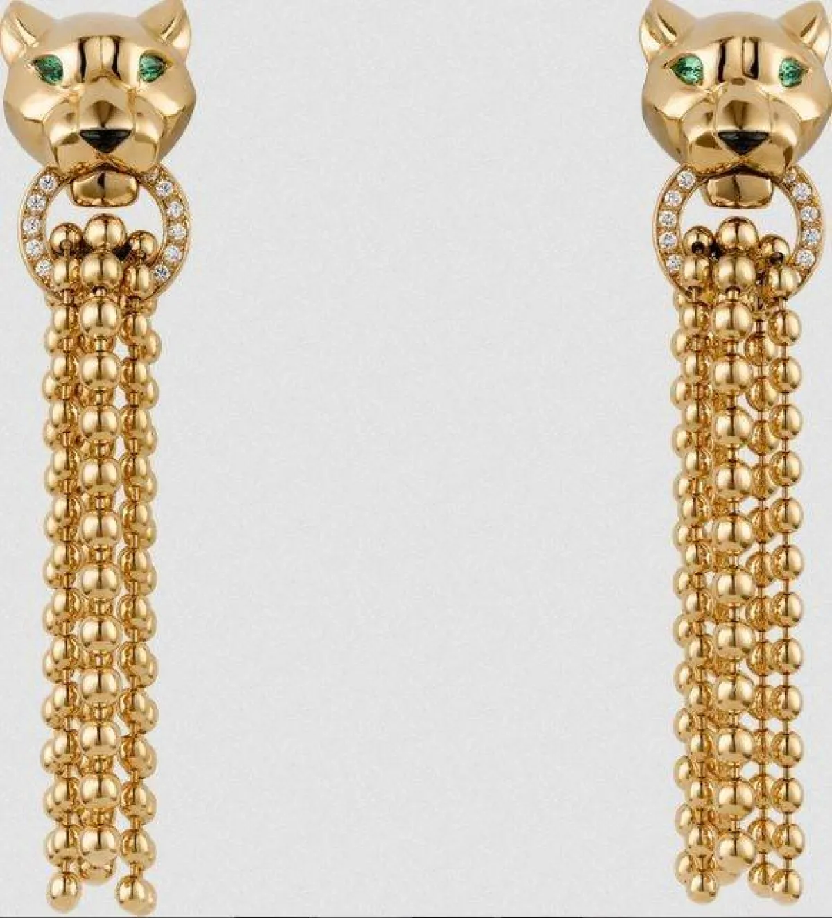 أما ماركة كارتييه Cartier فقدمت كعادتها موديلات أقراط تجمع بين الفخامة والجاذبية بتصاميم مبتكرة، أعجبنا منها لأقراط Panthère التي صُممت بسلاسل متدلية، من وجه فهد صُمم من الذهب الأصفر عيار 18 قيراطاً، بعيون من التسافوريت، فيما جاءت مرصعة بـ 34 ماسة قطع بريانت بوزن إجمالي 0.1 قيراطاً.
