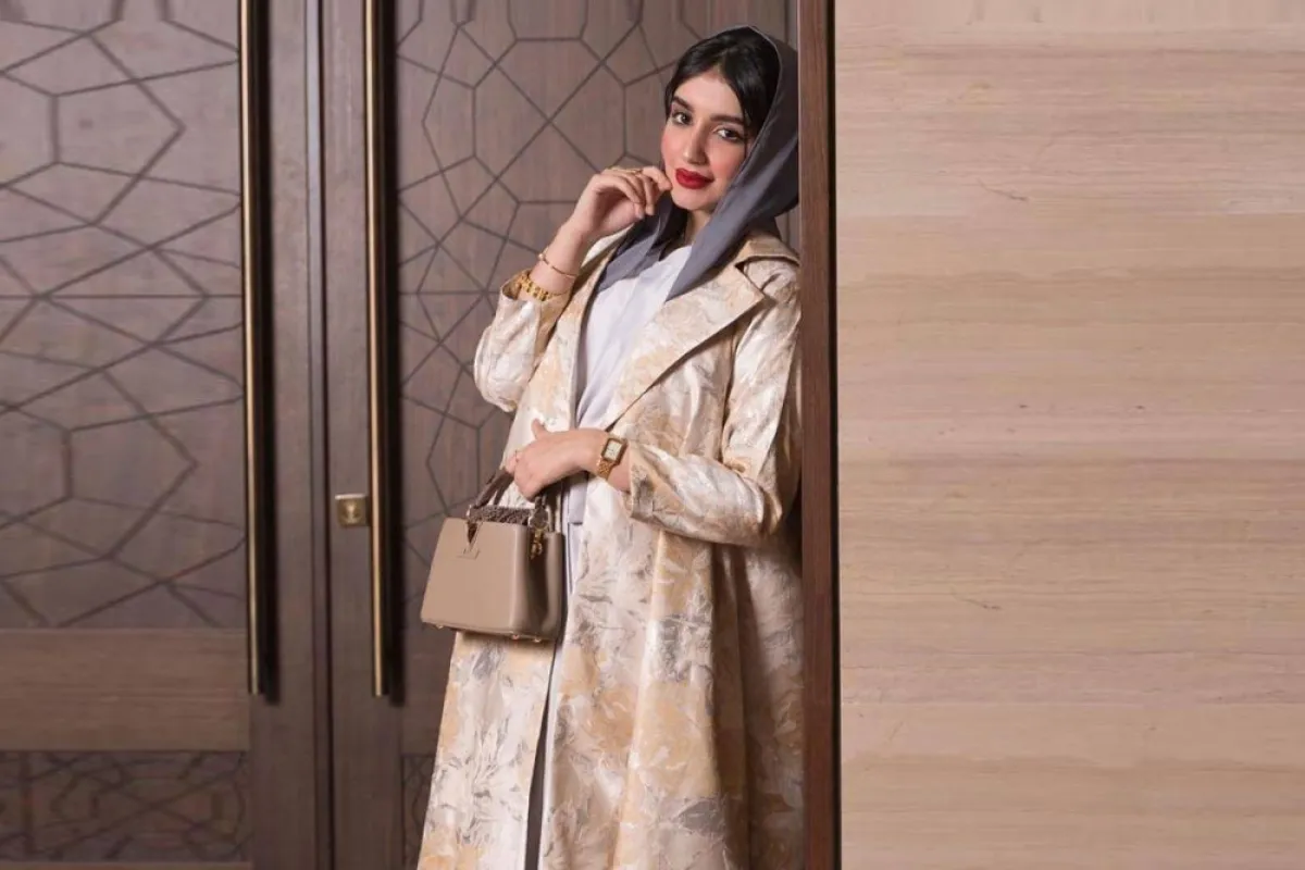 تُفضل مدونة الموضة رؤى الموالي اعتماد العبايات اللافتة وغير التقليدية التي تمنحها أسلوباً مميزاً، فاعتمدت عباية مُطرزة وصُممت الياقة بشكل طويل وعريض بقماش القطيفة باللون الأسود مع الأكمام الواسعة المطرزة بأشكال فضية ومرصعة بالخرز اللامع، ونسقت معها قطعة قماش إضافية على الخصر باللون الأسود حتى تمنح إطلالتها شكلاً مختلفاً وجذاباً، واختارت طريقة لف التوربان باللون الأسود حتى تليق مع العباية .