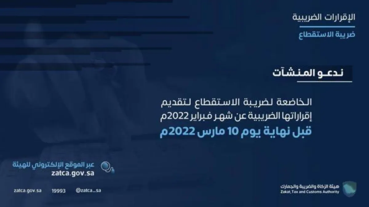 دعت هيئة الزكاة والضريبة والجمارك المكلفين من قطاع الأعمال الخاضعين لضريبة الاستقطاع في المملكة العربية السعودية إلى تقديم إقراراتهم الضريبية عن شهر فبراير الماضي، وذلك في موعدٍ أقصاه العاشر من شهر مارس الجاري.
