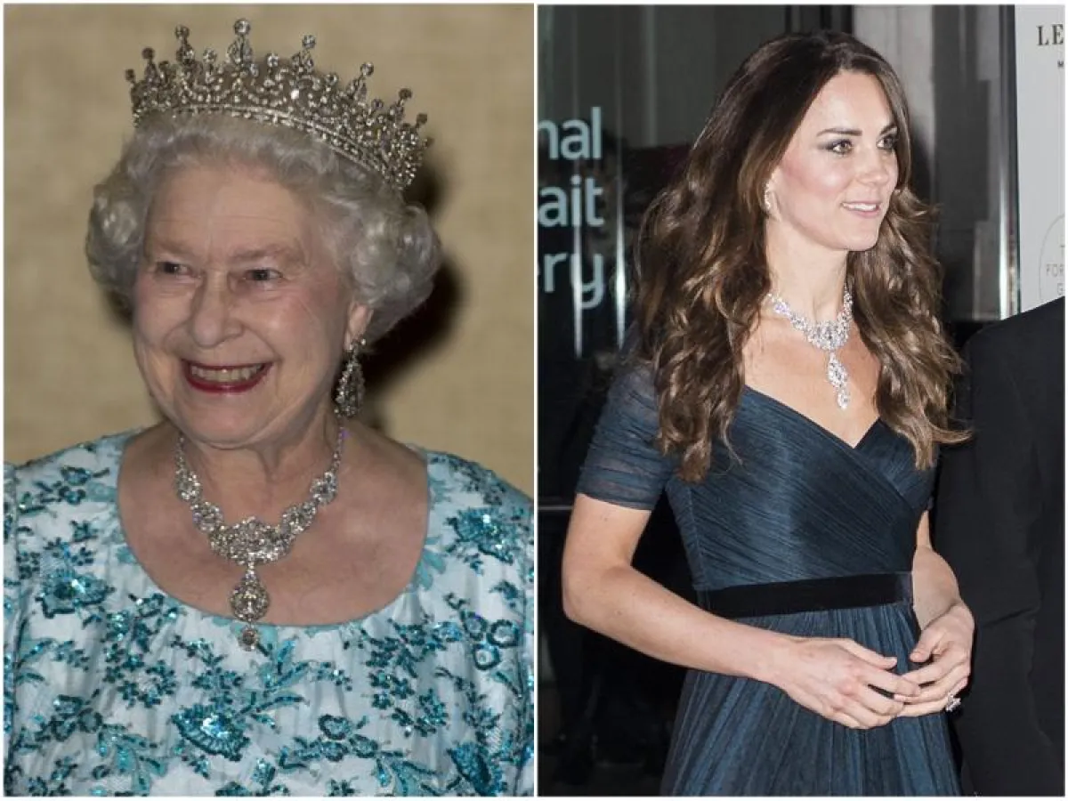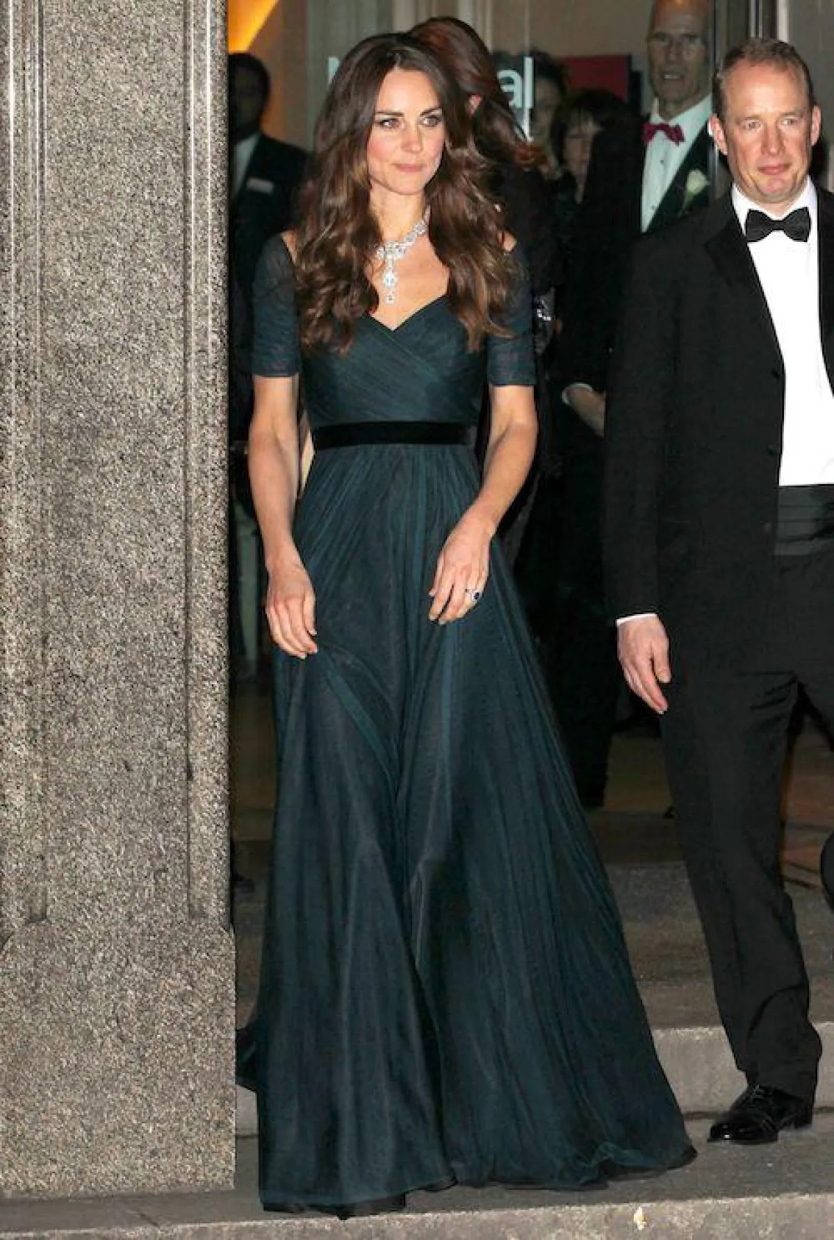 ظهرت الدوقة Kate Middleton بلوك ملكي أنيق، وعلى الرغم من أنها ارتدت أحد فساتينها القديمة من تصميم Jenny Packham، إلا أنها زادت من جمال إطلالتها بإضافة عقد ماسي براق استعارته من الملكة إليزابيث الثانية... شاهدي في الصور الملكة إليزابيث ترتدي العقد نفسه في إطلالة سابقة.