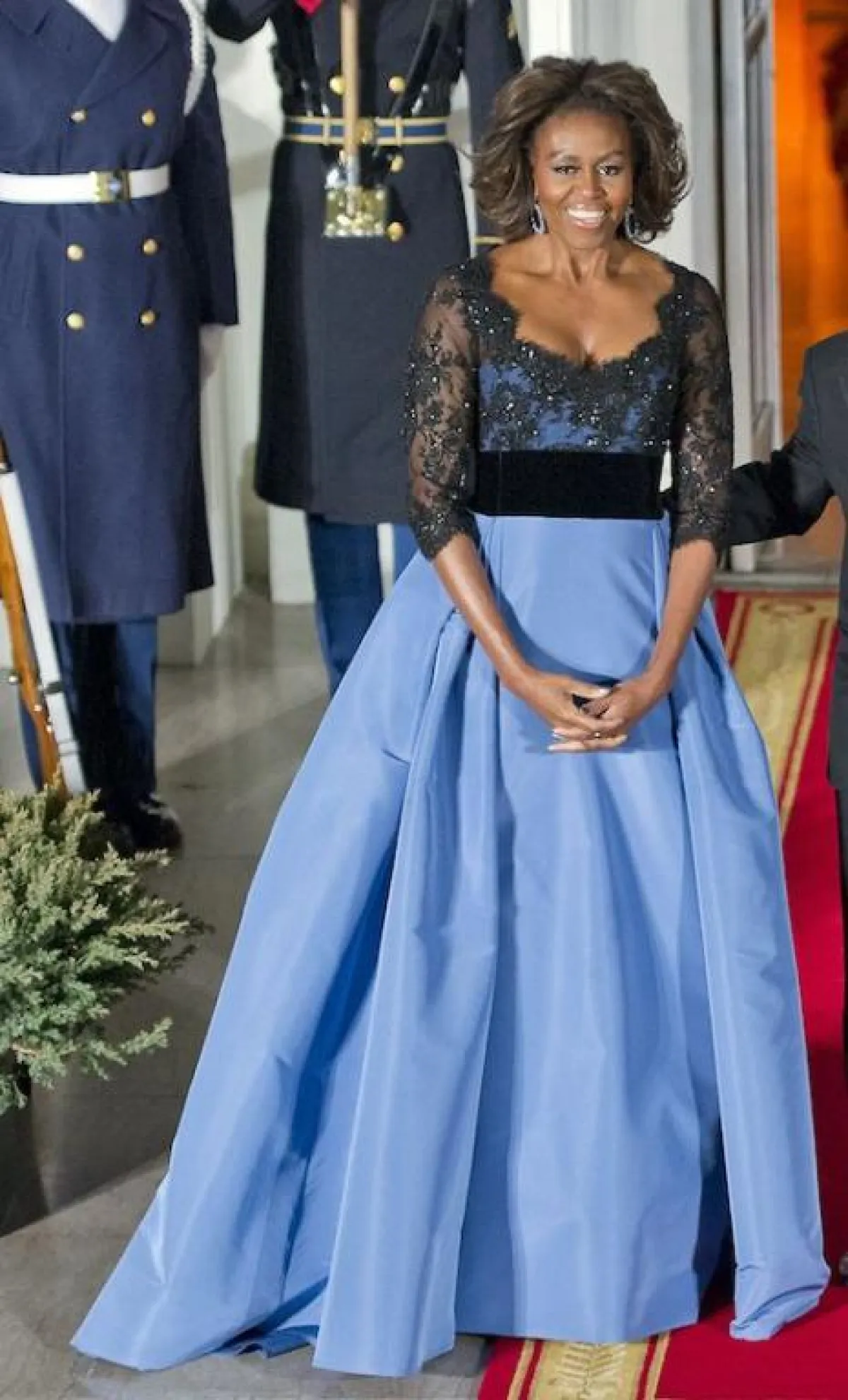 من ناحية أخرى ظهرت السيدة الأولى في الولايات المتحدة Michelle Obama بفستان سهرة جميل من المصممة Carolina Herrera، وقد تميز فستانها بلون ارجواني ناعم وتصميم لافت، ونسّقته مع أقراط جميلة بدون إي إضافات أخرى، مما زاد من جمال الإطلالة ورقيها.
