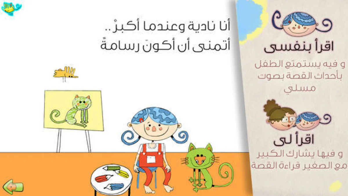 يقدّم هذا التطبيق قصة الفتاة "نادية" في تسعة مشاهد تتميز بالتفاعليّة وتدور حول هواية الرسم المفضلة لديها. يحتوي التطبيق أيضًا على لعبة الأحجية الممتعة ولعبة الاختلافات اللتين تعملان على تنمية التركيز وقوة الملاحظة في الطفل كما ويحتوي على خيار قيام الطفل بتلوين بعض الصور كذلك.