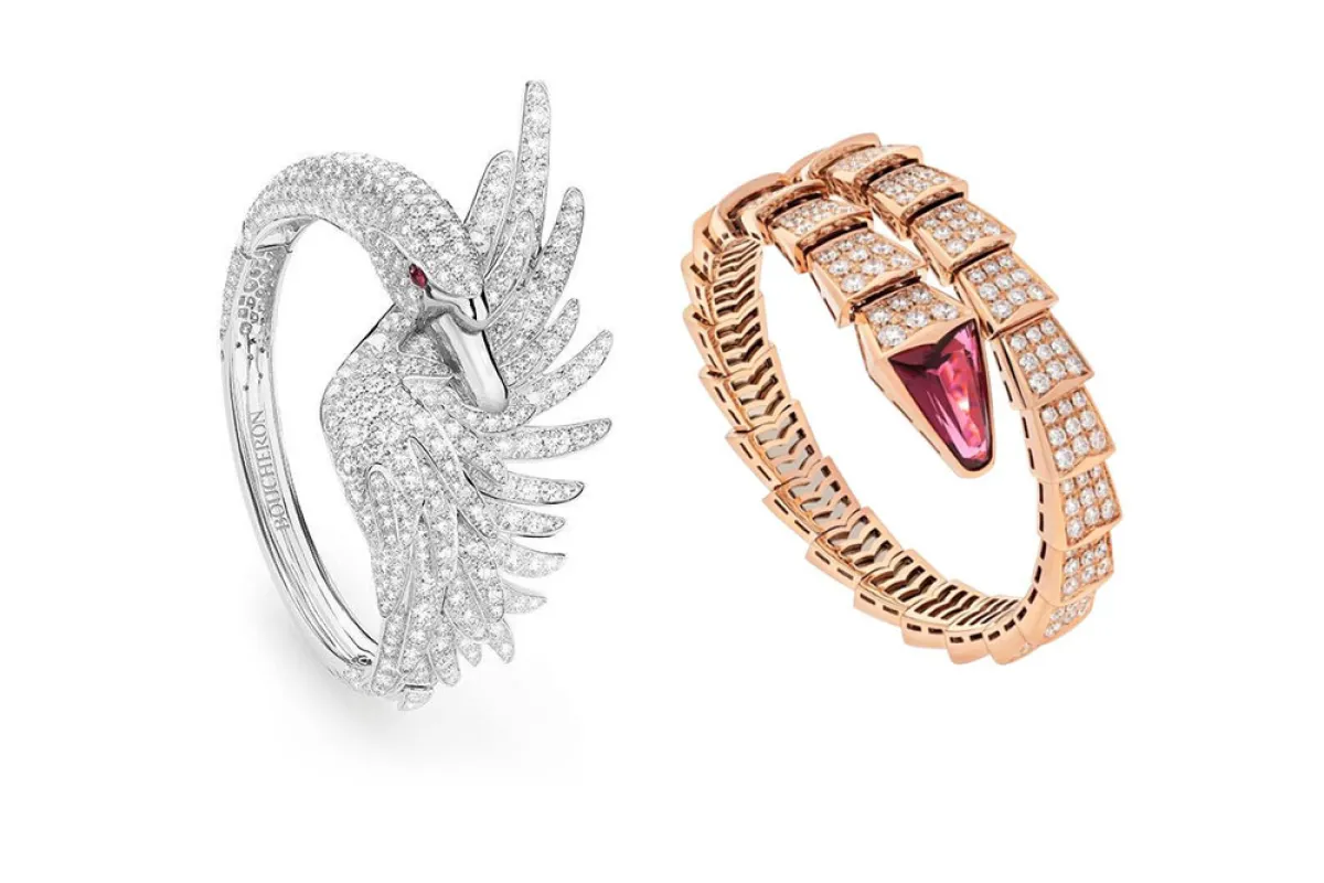 لتصميم أنيق يناسبك يوم زفافكِ، نرشح لكِ هذا التصميم الراقي لسوار عريض من ماركة بلغاري Bvlgari. صُمم السوار من الذهب الوردي عيار 18 قيراطاً، وجاء على شكل ثعبان، مرصوفاً بأحجار من الألماس تزن 7.44 قيراطاً، وجاءت رأس الثعبان من حجر الروبليت.