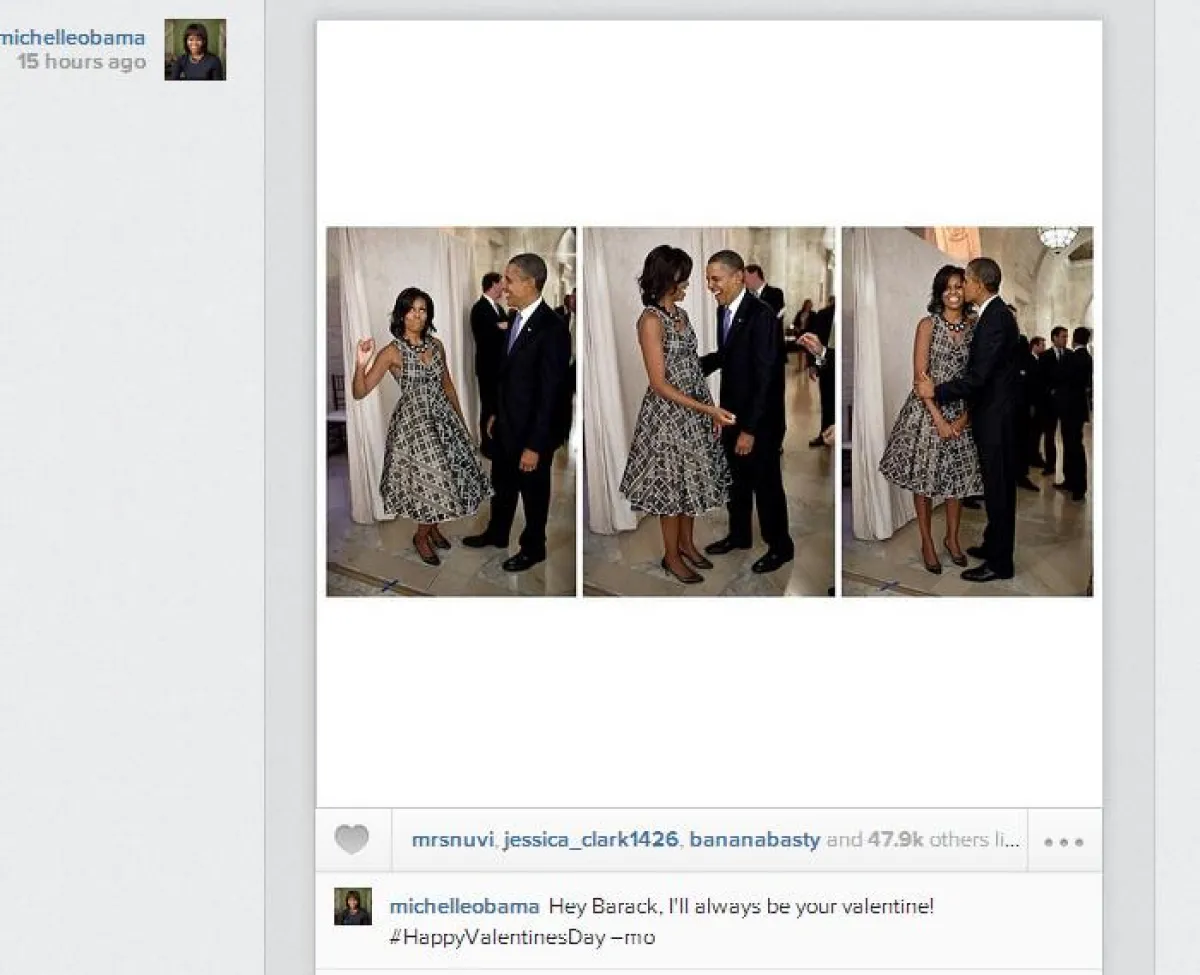أمّا عائلة Obama الرئاسية الأمريكية فكان احتفالها بالعيد بسيطاً جداً، عبر مواقع التواصل الاجتماعي، إذ قامتMichelle بنشر صور لها ولزوجها الرئيس على موقع إنستغرام، وهما يتعانقان، مرفقة بعبارة: "مرحباًBarack سأبقى دائماً حبيبتك، وعيد عشاق سعيد".