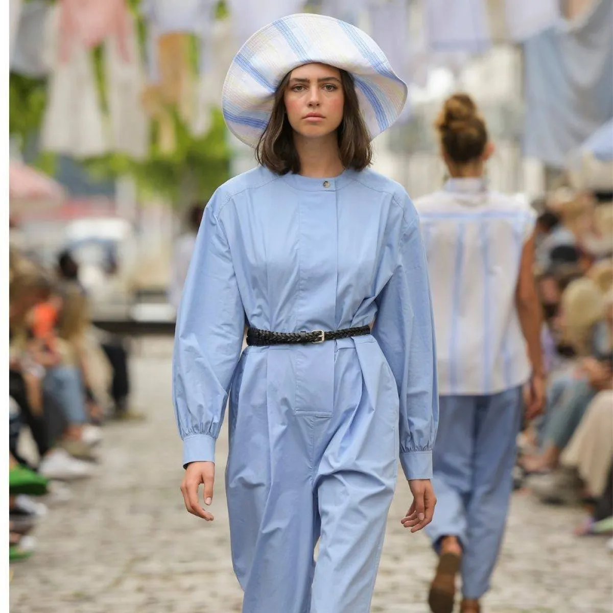 قدمت علامة أنييس. بي Agnes B العديد من موديلات الجمبسوت الأنيقة والكاجوال التي تناسب جميع الأذواق، وقد أعجبنا الجمبسوت المصمم باللون البيج وبأكمام طويلة وأرجل واسعة وياقة صغيرة وجيوب أمامية كبيرة على جانبي الخصر مع ثلاثة أزرار صغيرة باللون البيج وحزام طويل من القماش باللون البيج في منتصف الخصر، ويمكن ارتداء قبعة كاجوال باللون الأوف وايت أو الوردي مع حذاء رياضي باللون الأبيض .
