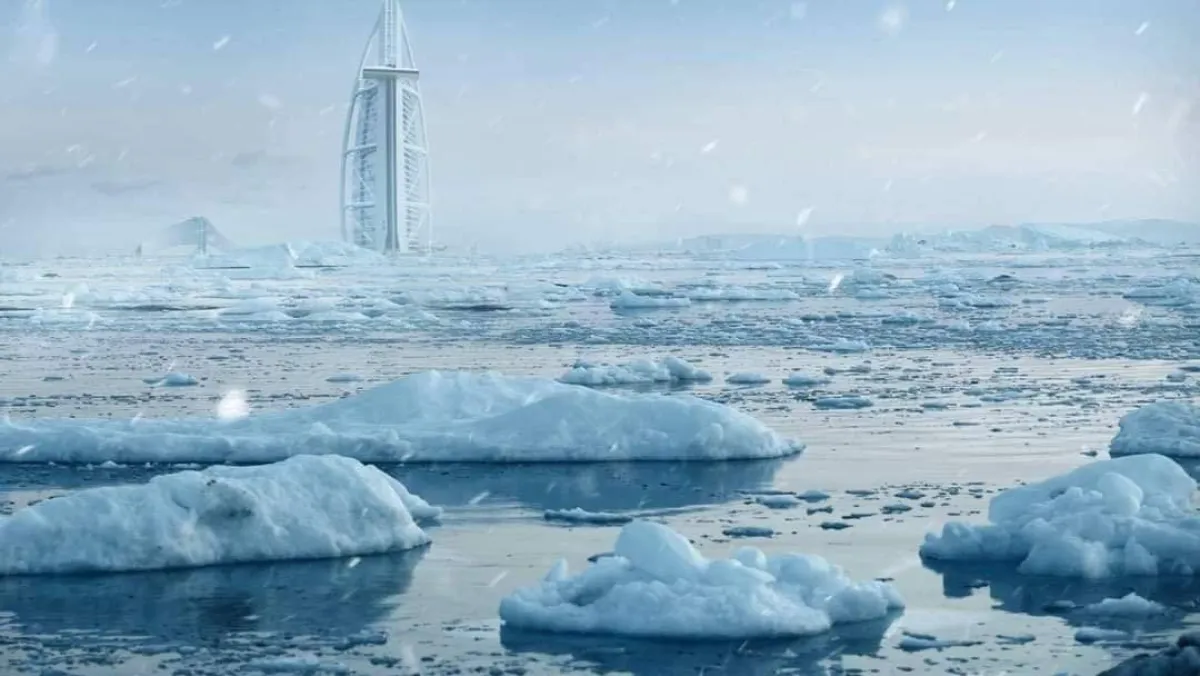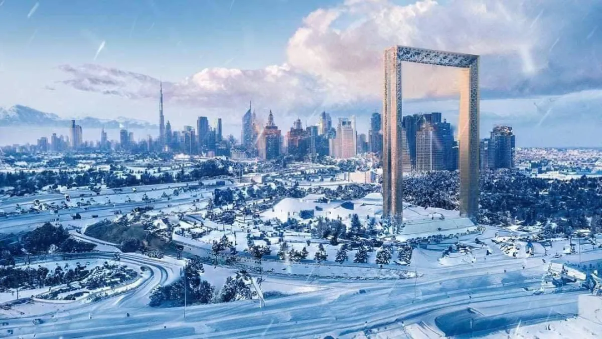 تخيل الفنان المقيم بدبي منذ 16 عاماً سلسلة من الصور المرئية حول كيف سيكون شكل الشتاء في دبي الثلجية، فمن برج خليفة لبرج العرب، وإطار دبي إلى مترو دبي ومتحف المستقبل تتساقط الثلوج ويعم الصقيع وتتناثر كرات البَرد في كل مكان..