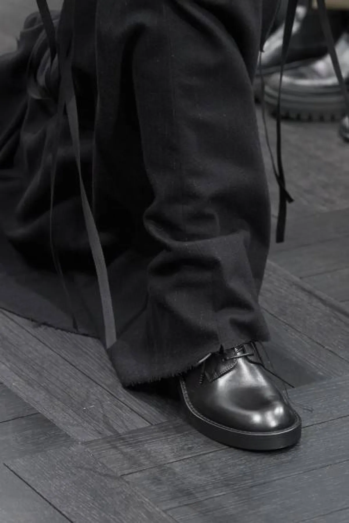 إذا كنتِ تبحثين عن تصميم عملي ومريح لحذاء رسمي يتمتع بالعصرية والبساطة، نرشح لكِ هذا الحذاء من ماركة آن ديميليميستر Ann Demeulemeester، والذي صُمم من الجلد الأسود بمقدمة دائرية ونعل عريض وعالٍ، مع أربطة أمامية سوداء على منتصف القدم، مما يمنحكِ إطلالة رسمية أنيقة.