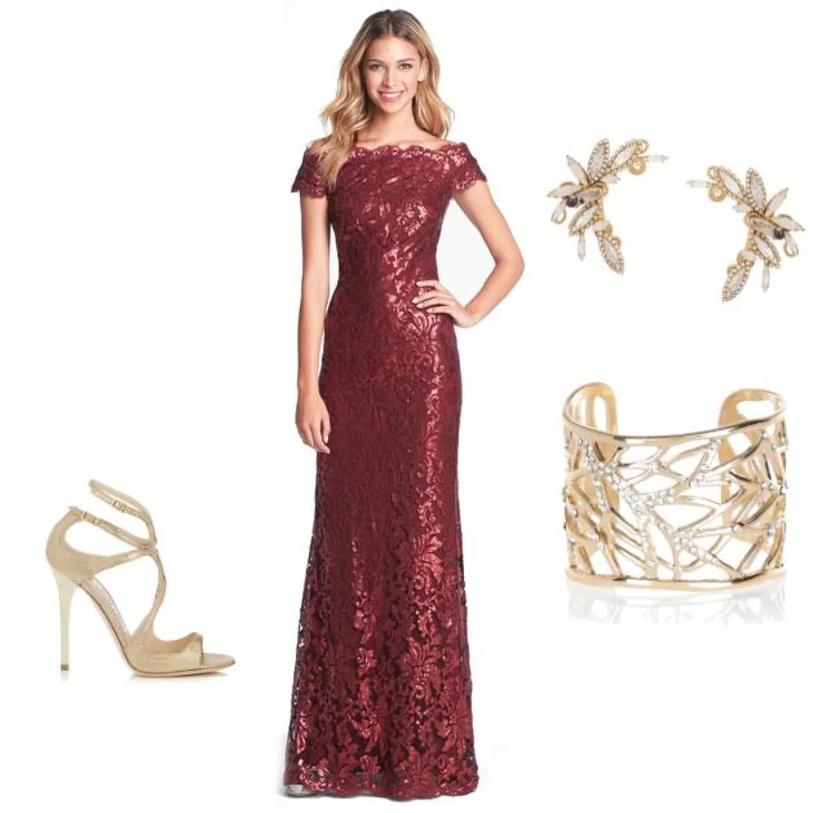 استوحينا من هذه الإطلالة لوكاً مشابهاً بفستان أنيق بنفس اللون من المصمم Tadashi Shoji، ولنزيد من فخامته نسقناه مع حذاء ذهبي جميل من Jimmy Choo، وأكملنا اللوك بمجوهرات ذهبية براقة.