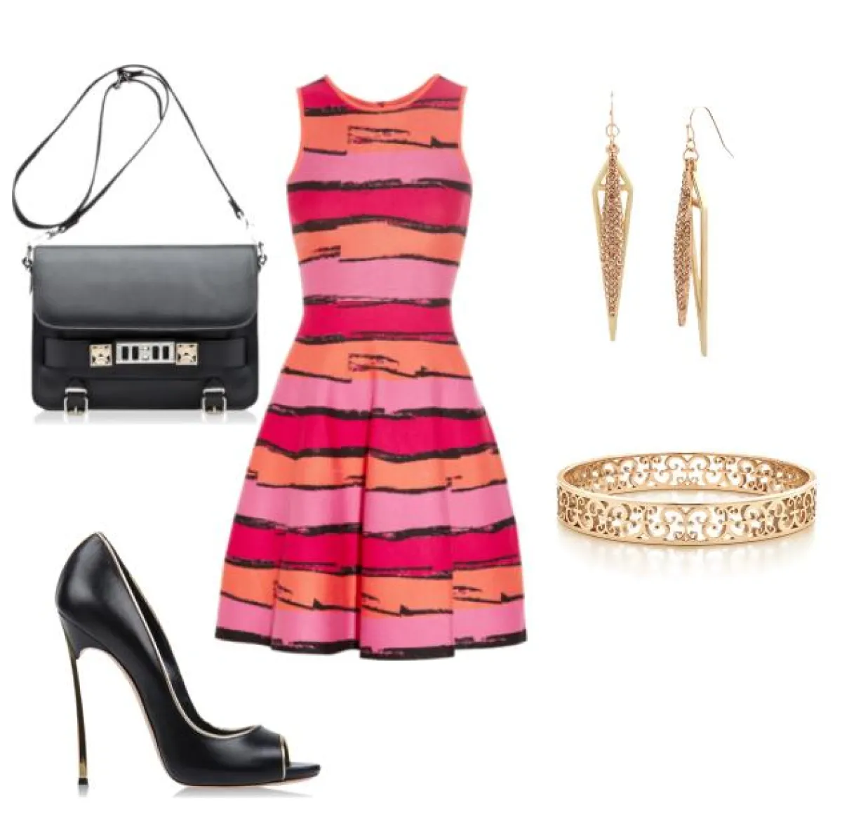 إن وجدت صعوبة في دمج الألوان المشرقة مع بعضها في إطلالة واحدة، فننصحك باختيار فستان يجمع تلك الألوان معاً كما فعلنا في هذا اللوك.