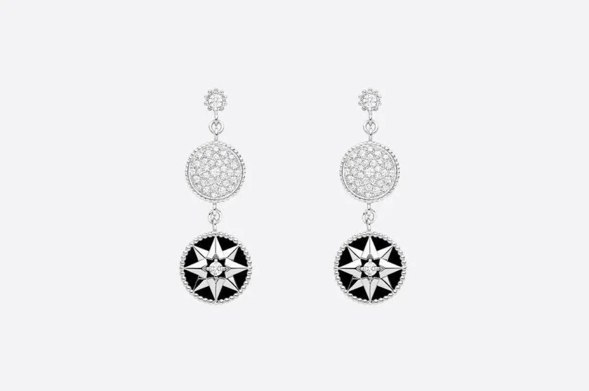 لتصميم أنيق أكثر نعومة وجاذبية في يوم زفافكِ، نرشح لكِ أقراط Rose Des Vents، من ماركة ديور Dior، التي صُممت على شكل نجمة ذات 8 رؤوس من الذهب الأبيض عيار18 قيراطاً، جاءت مرصعة بحجر الأونيكس، مع أحجار من الألماس بوزن 0.084 قيراطاً.