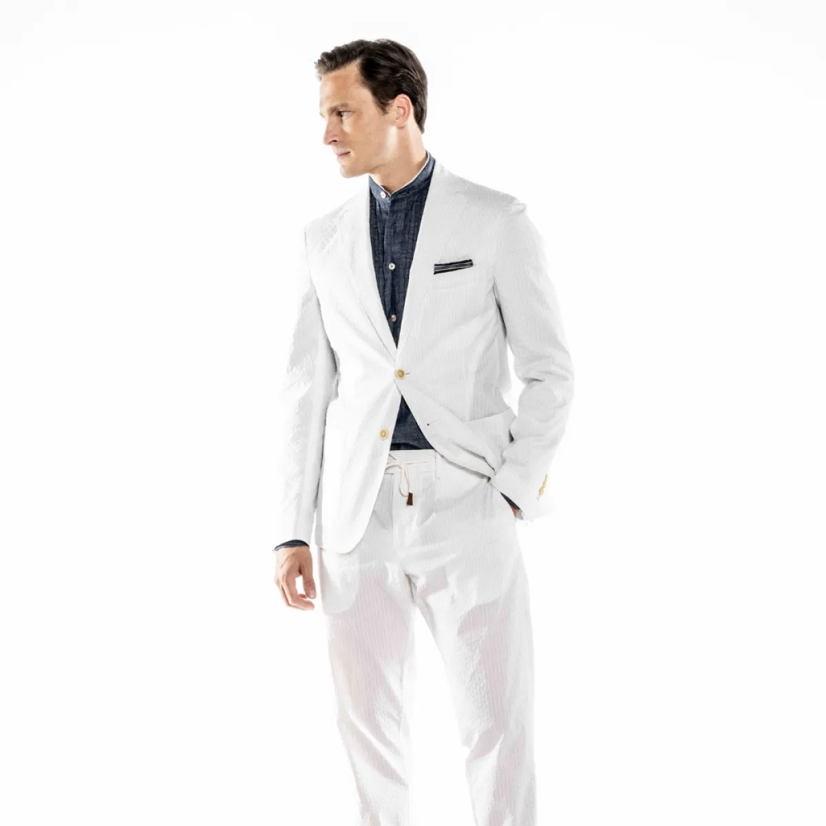 يفضل بعض الرجال اعتماد البناطيل الكلاسيكية في أغلب الإطلالات، حيث تليق على الكثير من الأزياء اليومية، وأعجبنا هذا البنطلون من Eleventy المصمم من القماش باللون الأبيض، وجاء بقصّة ضيقة وقصيرة مع ثنيات عريضة أسفل السروال وجيوب أمامية واسعة وخصر عريض وحزام رفيع من القماش وجاء بخطوط رفيعة باللون الأبيض، نسقه مع بليزر باللون الأبيض وقميص باللون الكحلي أو الأسود .