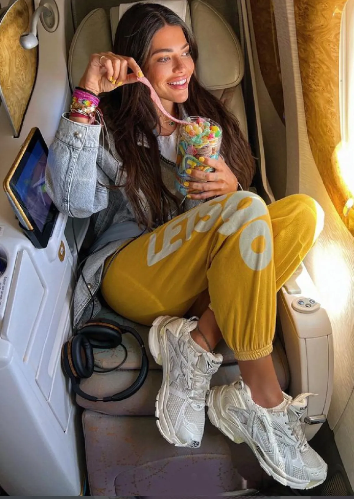 وخلال تواجدها في الطائرة ظهرت فوزازا بسروال رياضي أصفر، ونسّقته مع سترة قصيرة من الدنيم الأزرق، وانتعلت حذاء رياضياً أبيض. وتوّجت إطلالتها المريحة بإكسسوارات من سوار عريض وسلاسل متفاوتة الطول حول عنقها.