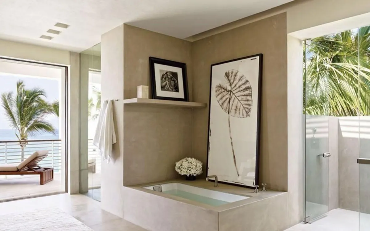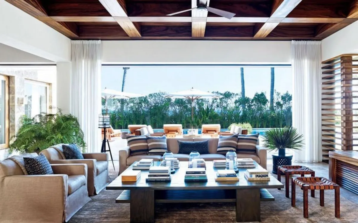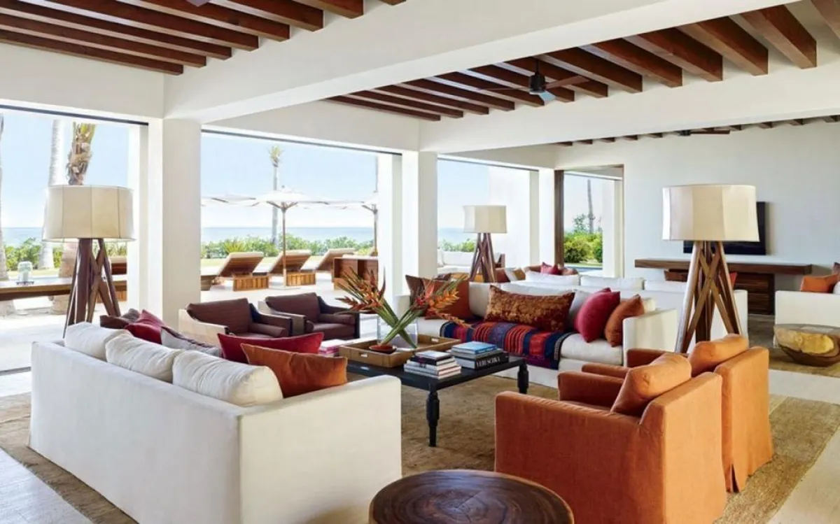 ويحظى الثنائي بإطلالة بانوراميّة على البحر، حين يستلقيان على إحدى الأرائك في غرفة المعيشة، التي تزدان بالوسائد ذات الألوان الحارة، وتحوطهما "الأباجورات" الطويلة التي تتكئ إلى السجادة الجذّابة.